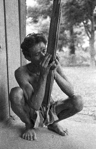 Village man playing the khāēn (khaen, musical instrument), 2 photos, Ban Nong Tun, Amphoe Muang, Changwat Maha Sarakham, Thailand, October 1963