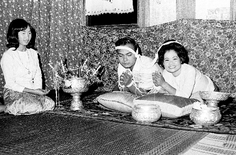 La's wedding: close-up of bridal couple, Amphoe Mae Sariang, Changwat Mae Hong Son, Thailand, January 1968