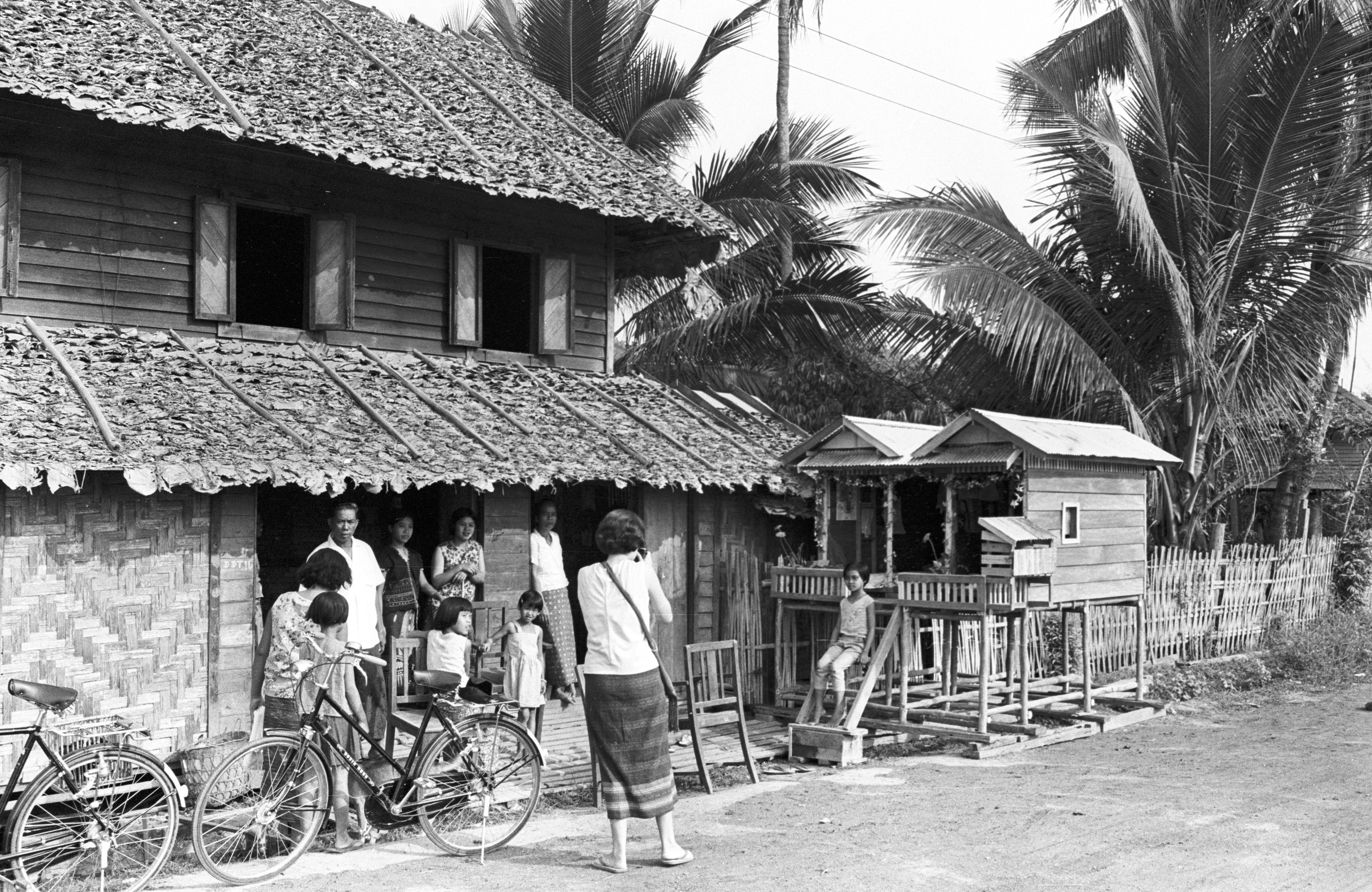 Pôi Khao Sang (rite of offering house and goods to make merit for a deceased person) at house, 4 photos, Amphoe Mae Sariang, Changwat Mae Hong Son, Thailand, March 1968