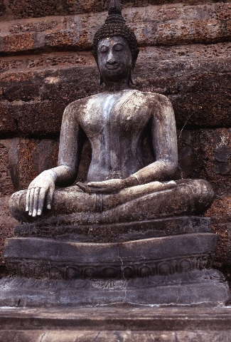 Close up of seated image of Buddha, Sukhothai, Thailand, August 1968
