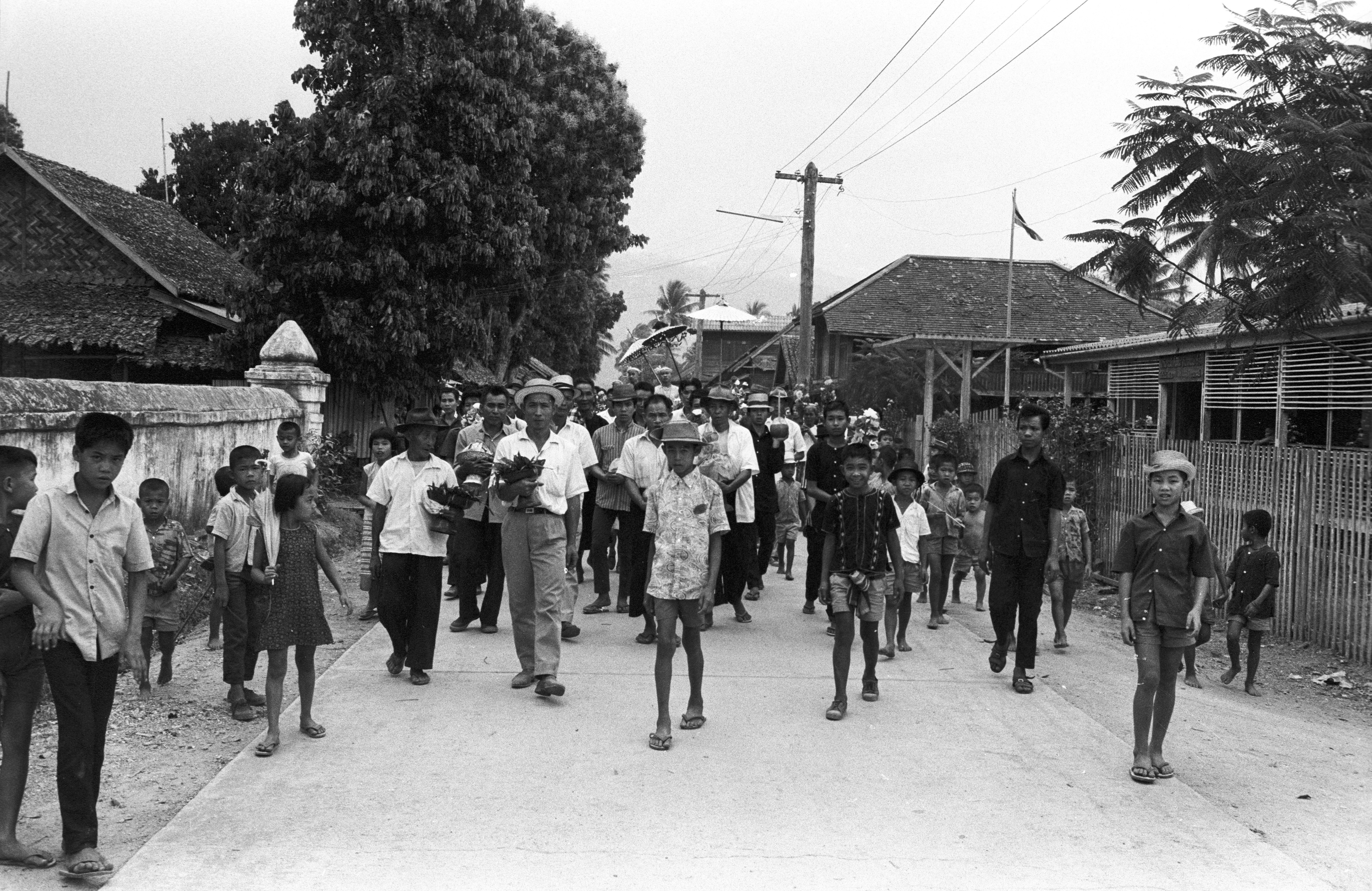 Ordination – Procession of the jewel child (hāē lūk kāēo) on way to wat, entering grounds, circling the ordination hall of Wat Kittiwong, 10 photos, Amphoe Mae Sariang, Changwat Mae Hong Son, Thailand, March 1968