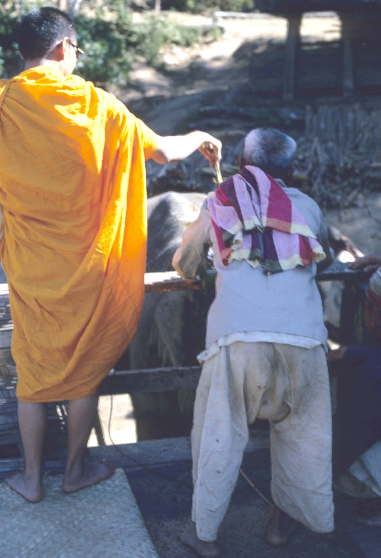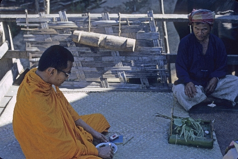 Phra Khrū making sompôi water for ritual with elephant, Phra Khrū sprinkling sompôi water on elephant, 2 photos, Ban Dong, Thambon Huai Hom, Amphoe Mae Sariang, Changwat Mae Hong Son, Thailand, January 1968