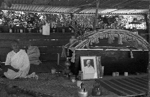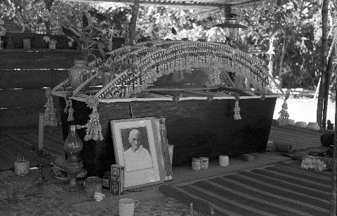 Coffin of deceased nun at nunnery, 3 photos, Ban Nong Sung, Changwat Mukdahan, Thailand, December 1963