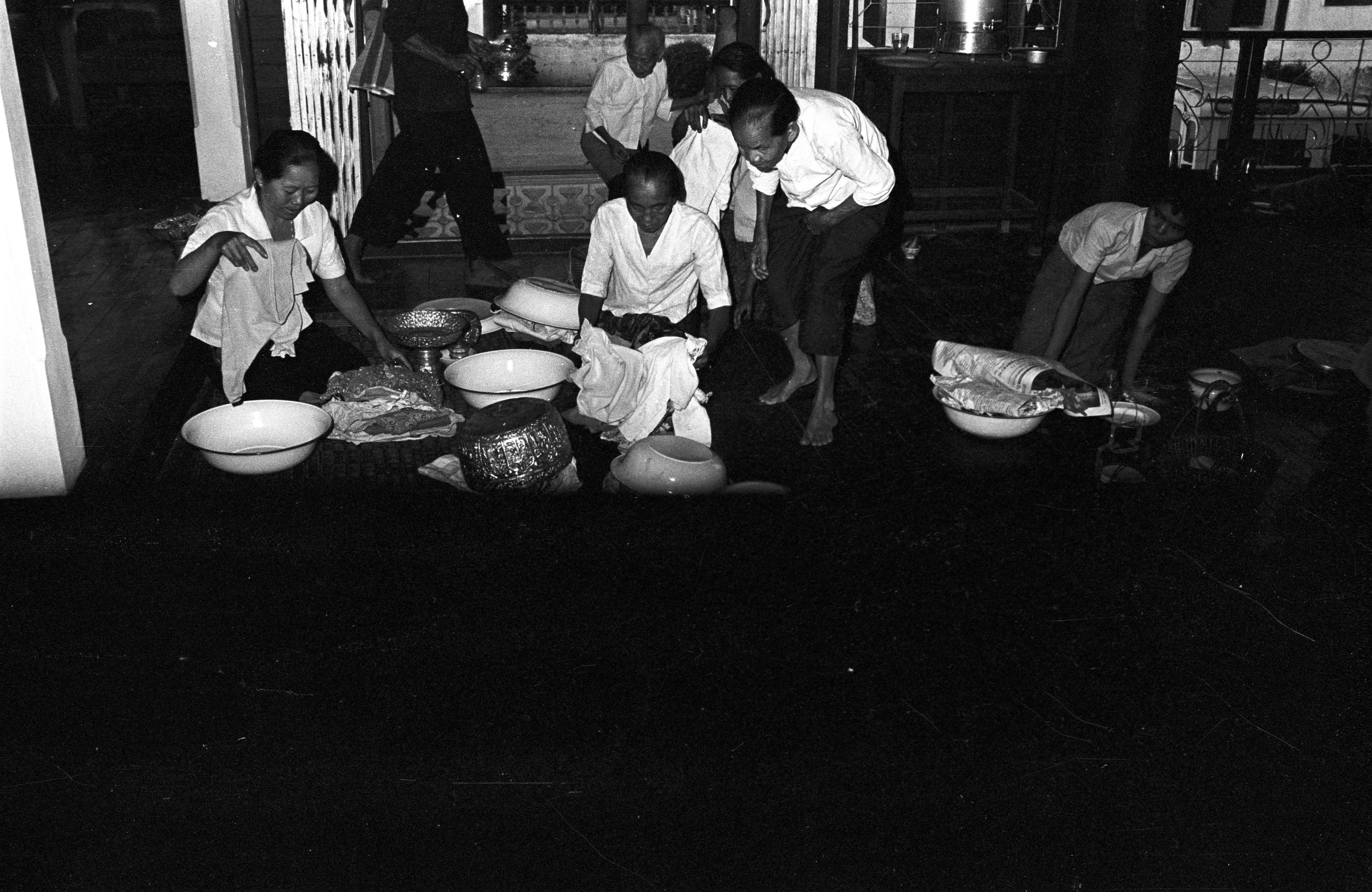 Songkran at Wat Kittiwong: women preparing for ritual pouring (damhua) of water on monks, 2 photos, Amphoe Mae Sariang, Changwat Mae Hong Son, Thailand, April 1968
