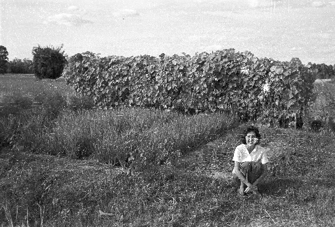 Jane Keyes in front of beanstalks, Ban Nong Tun, Amphoe Muang, Changwat Maha Sarakham, Thailand, December 1963
