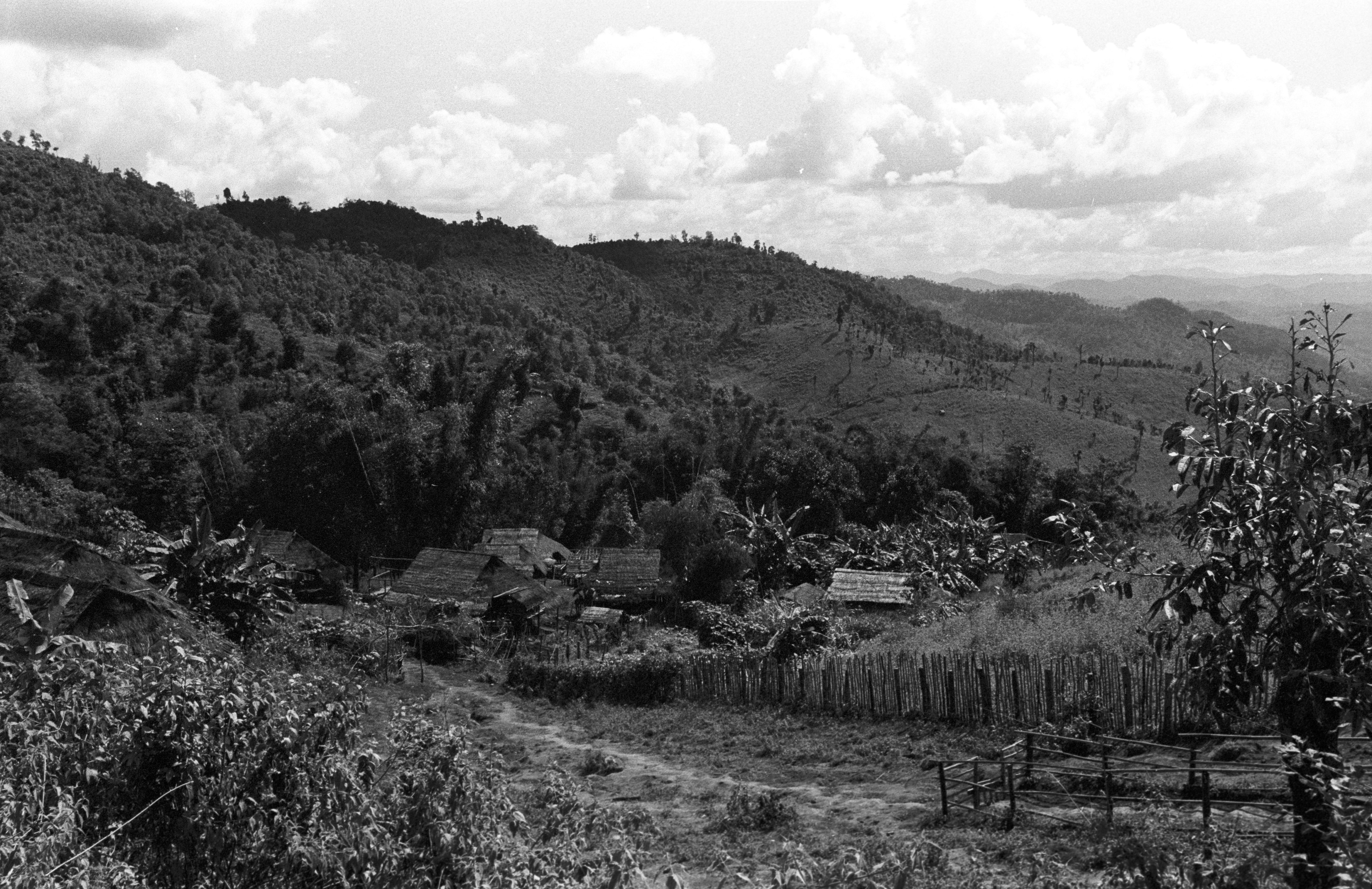 S'gaw Karen village: general scene, Ban Huai Kung, Thambon Pa Pong, Amphoe Sop Moei, Changwat Mae Hong Son, Thailand, October 1968