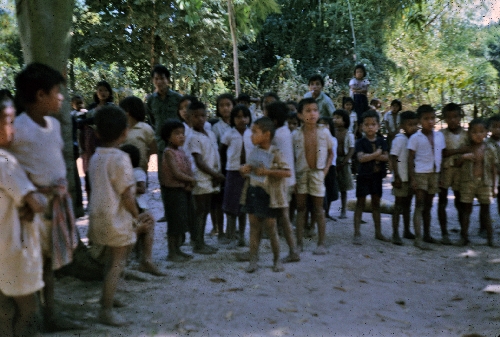 Village school children with the provincial educational supervisor, Ban Nong Tun village, A. Muang, Changwat Maha Sarakham, December 1963