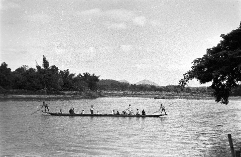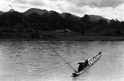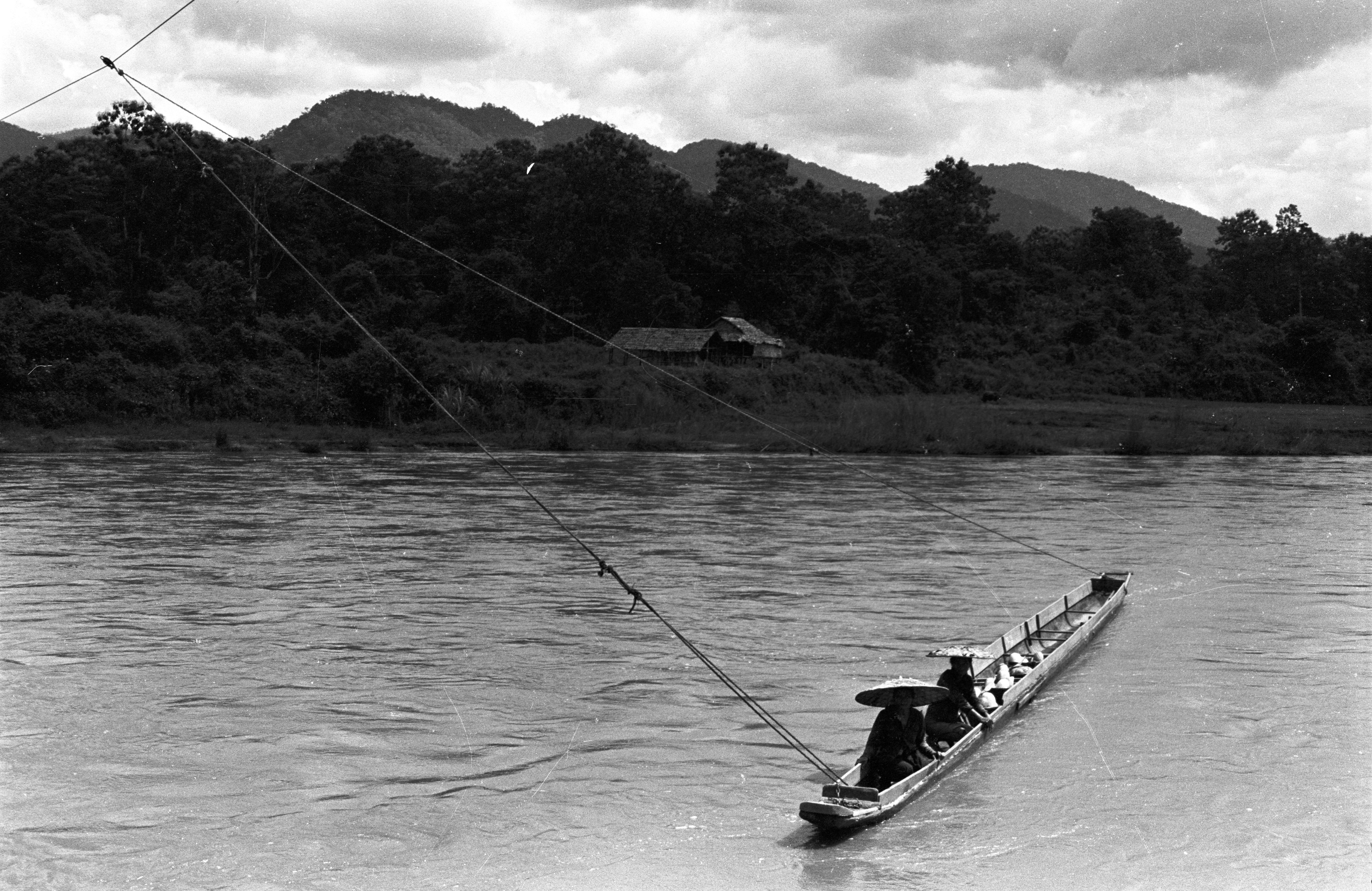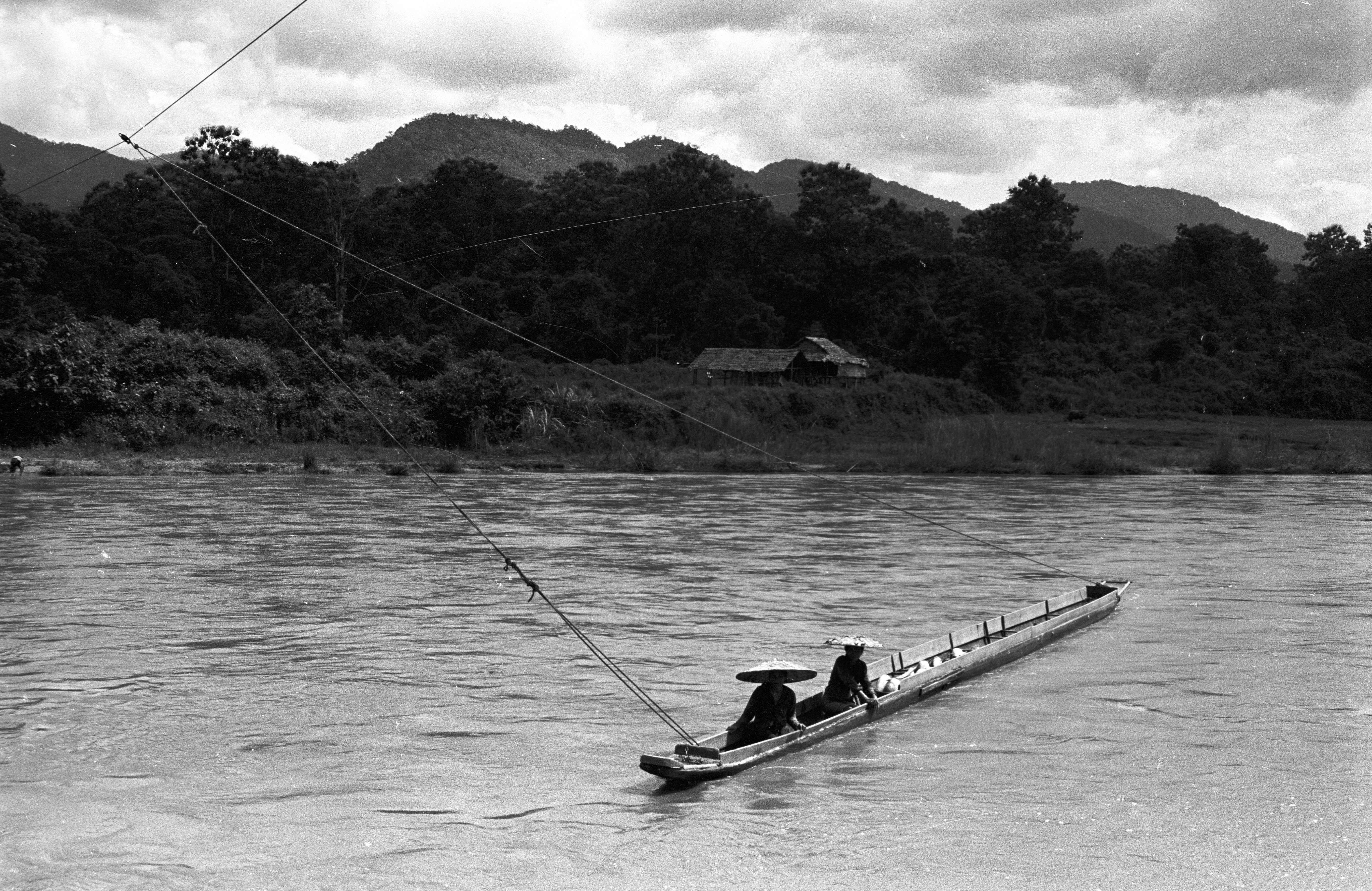 Visit to villages south of Mae Sariang in Tambon Māē Yuam: boat on river, 3 photos, Mae Hong Son Province, Thailand, October 1967