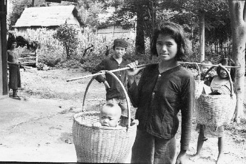 Woman on her way to the fields with children in carrying baskets, Ban Nong Tun, Amphoe Muang, Changwat Maha Sarakham, Thailand, May 1963