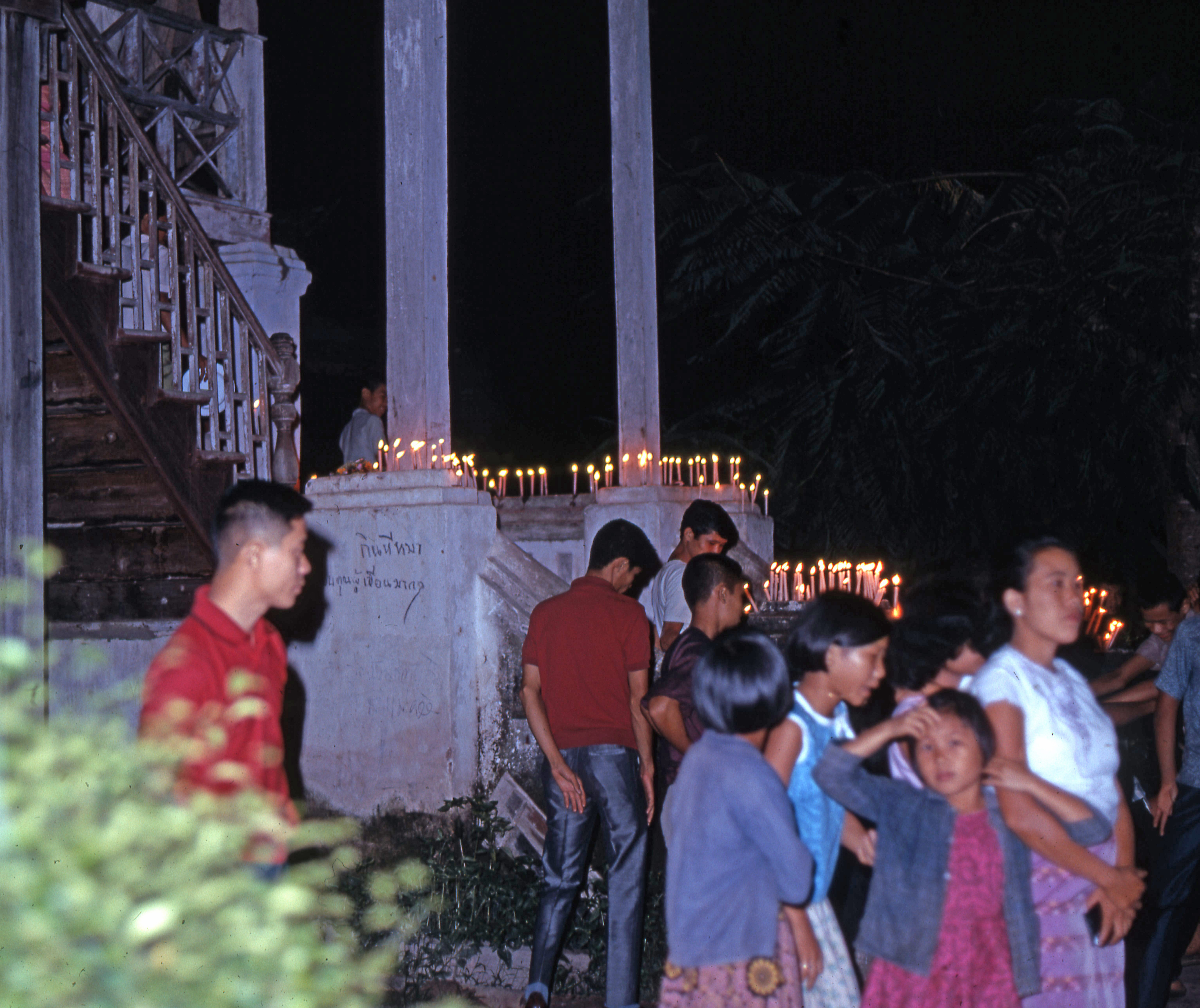 Hāēthiang hāēng, candle procession for ôk phansā, end of lent -- entrance to main building in wat, 3 photos, Amphoe Mae Sariang, Changwat Mae Hong Son, Thailand, October 1967