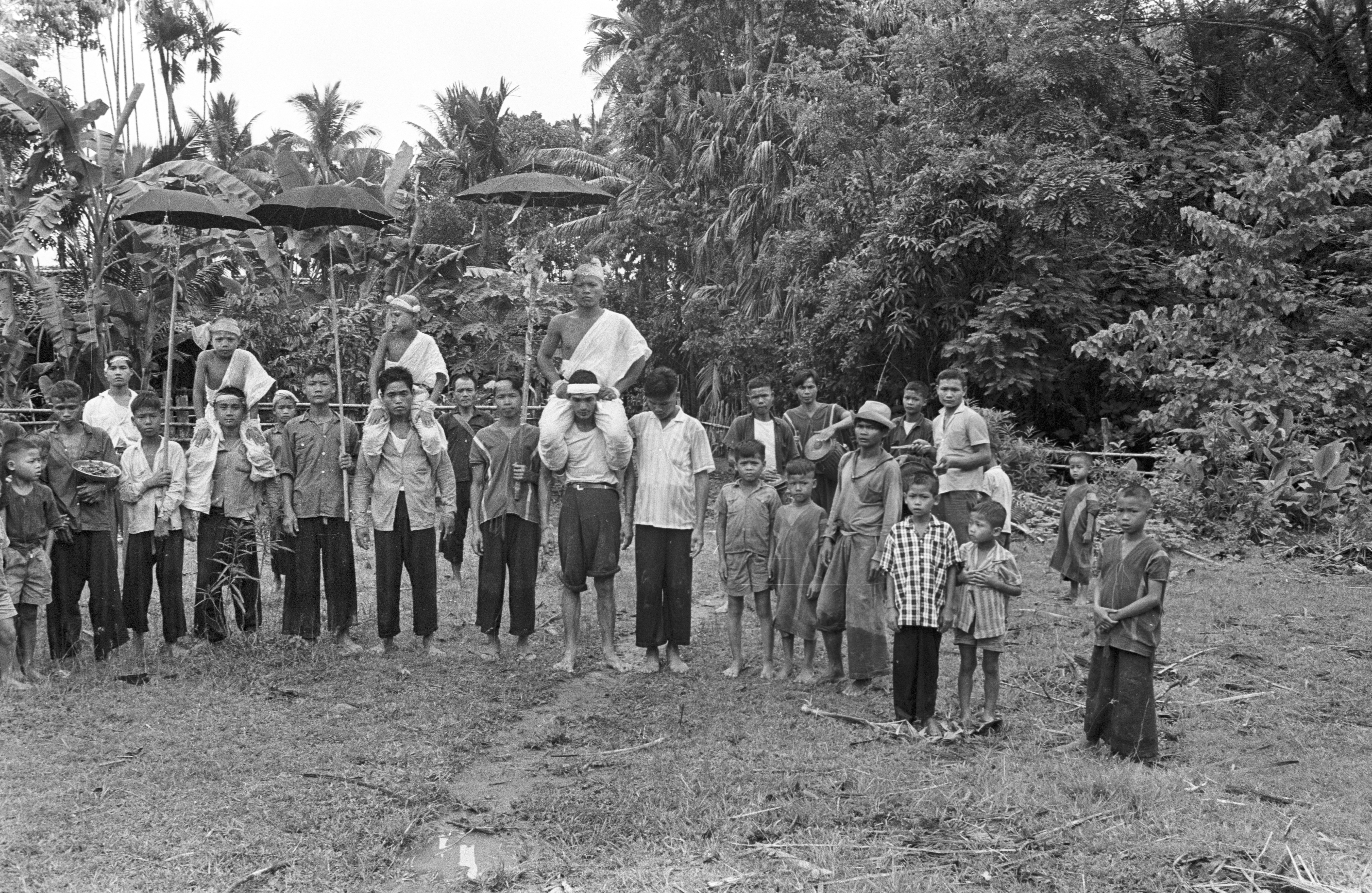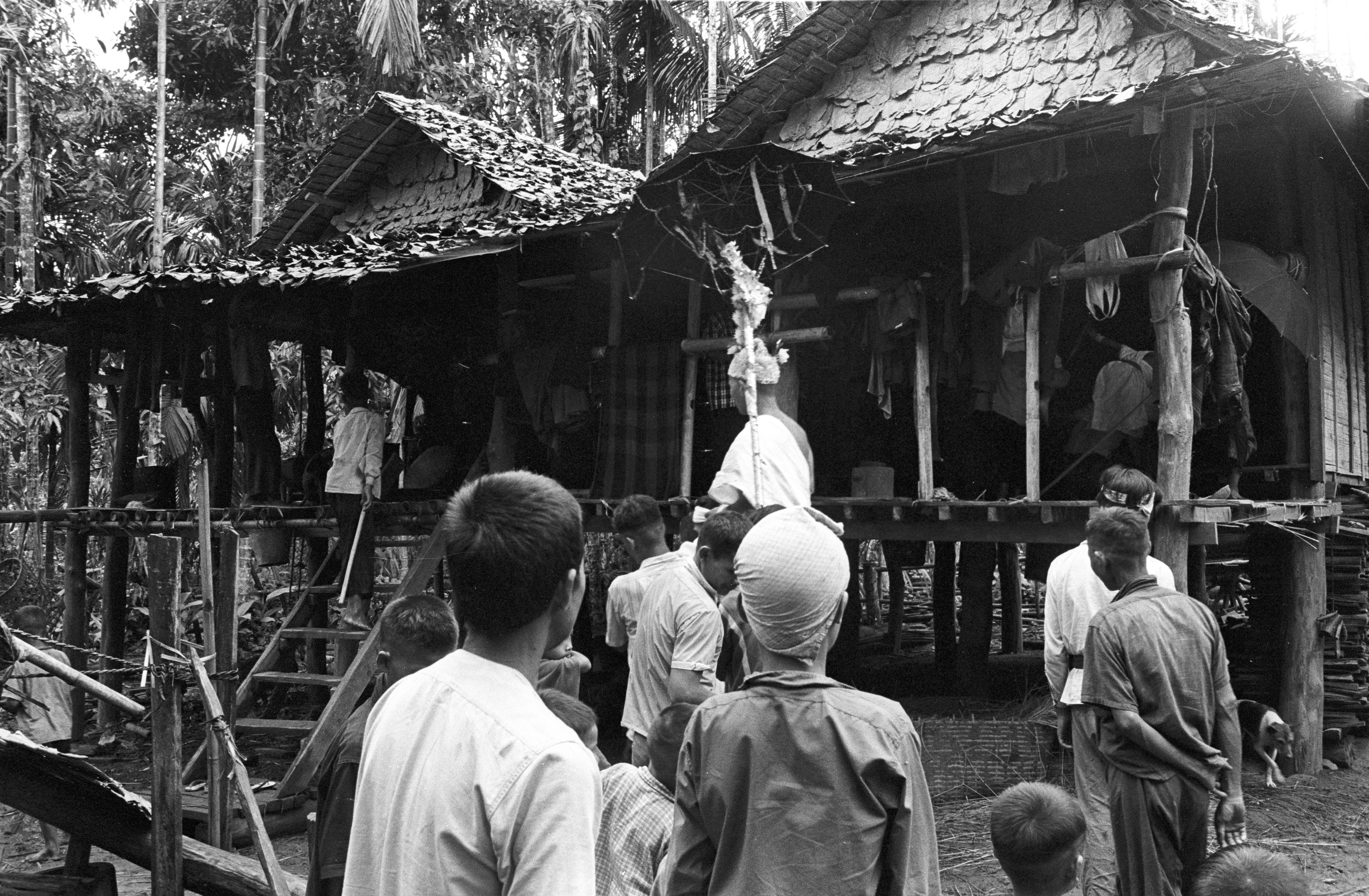 S'gaw Karen village: procession of the “jewel child” (hāē lūk kāēo) going through village, 4 photos, Ban Pa Mak, Amphoe Mae Sariang, Changwat Mae Hong Son, Thailand, June 1968