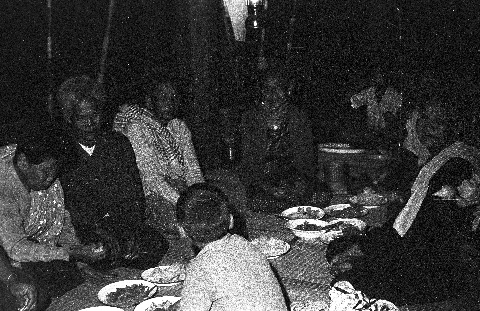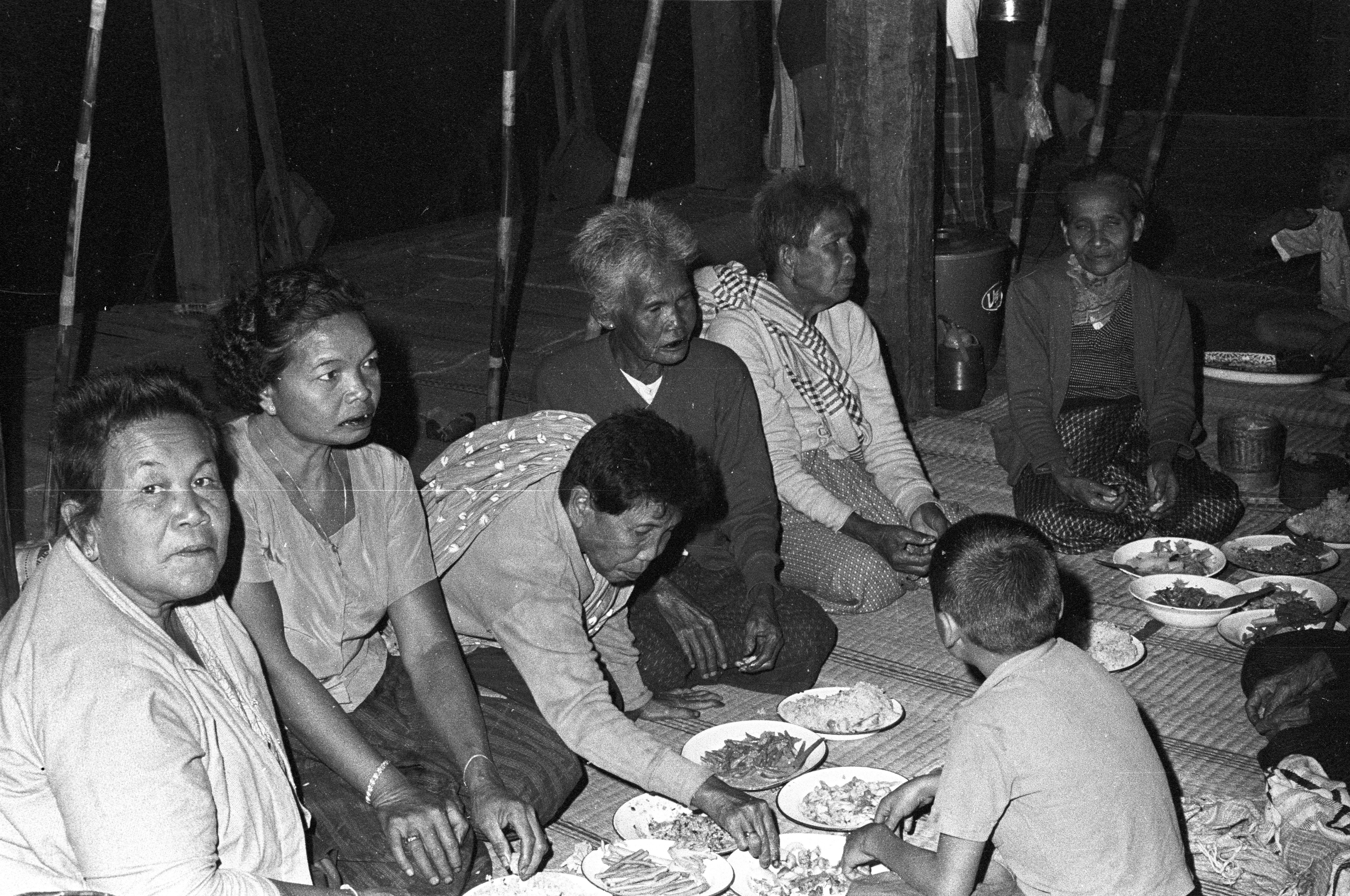 Suatmon yen at Wat Ban Nông Tün: villagers eating, 2 photos, Maha Sarakham Province, Thailand, November 1967