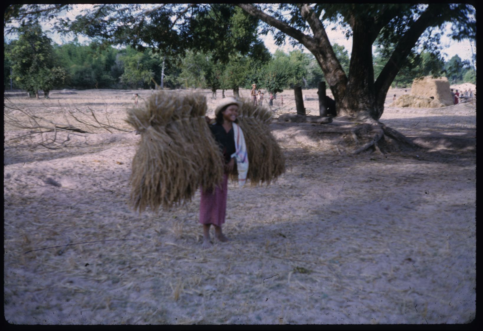 Young woman carrying harvested rice sheaves on pole, Ban Nong Tun village, A. Muang, Changwat Maha Sarakham, December 1963