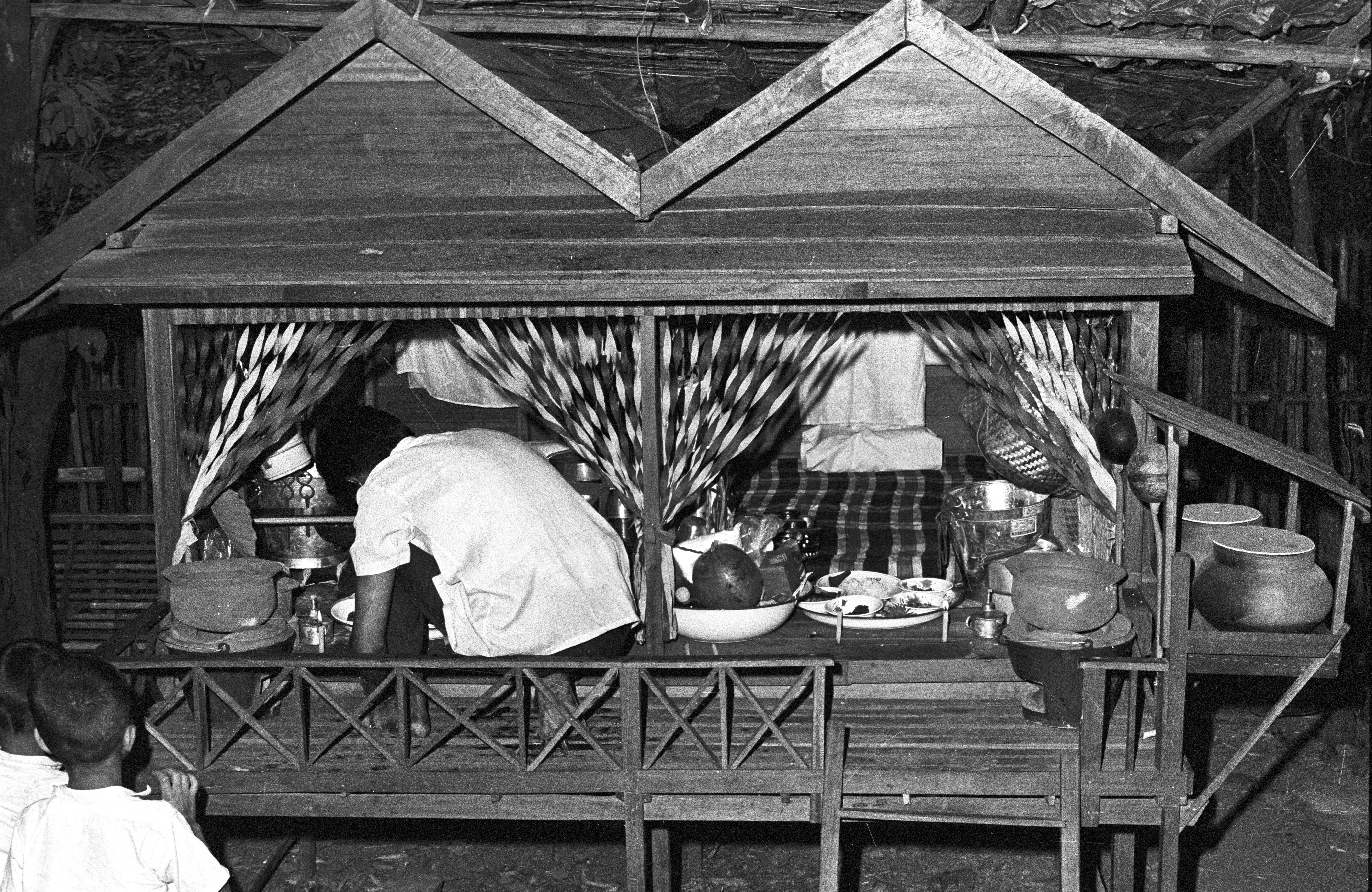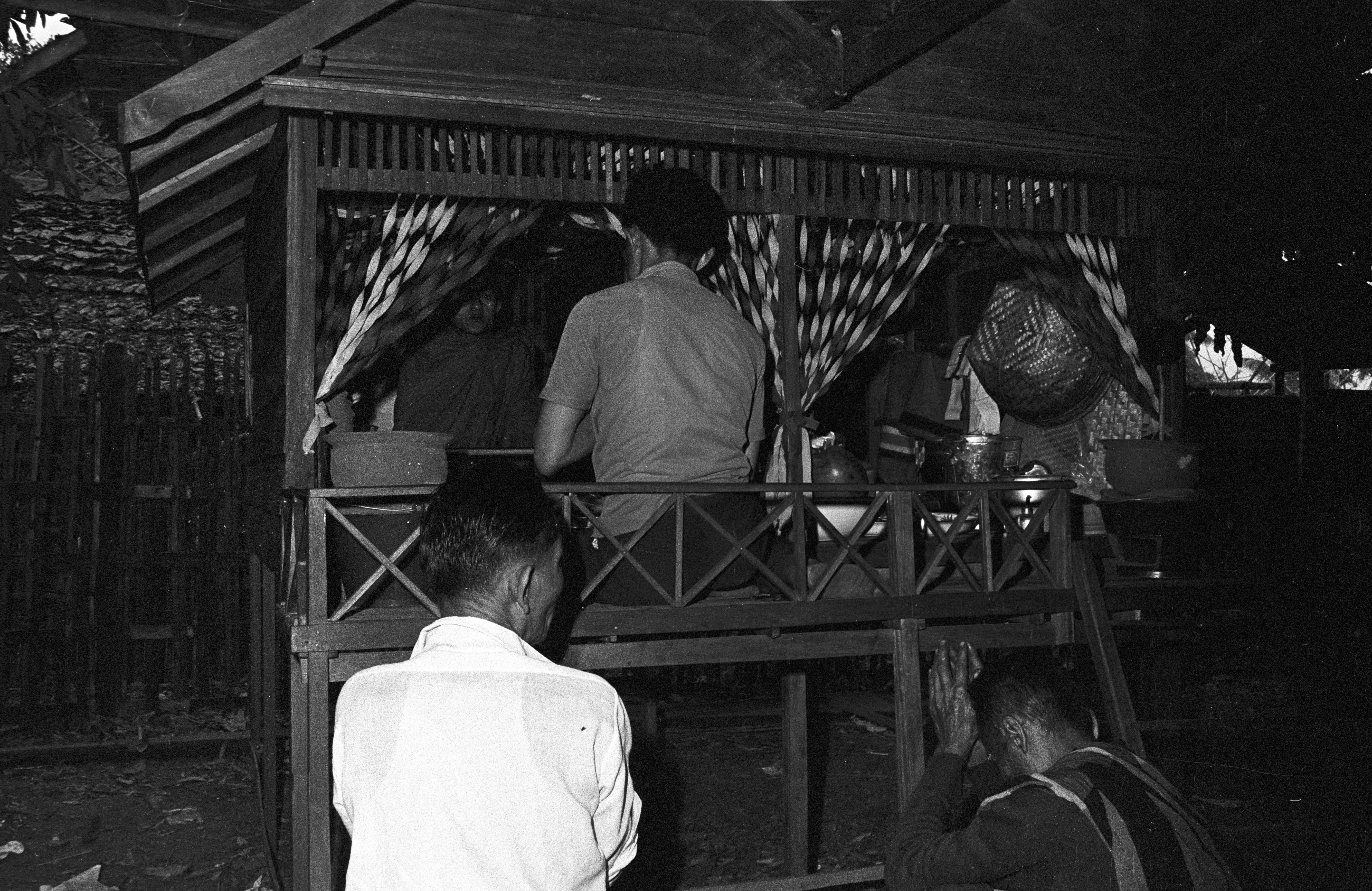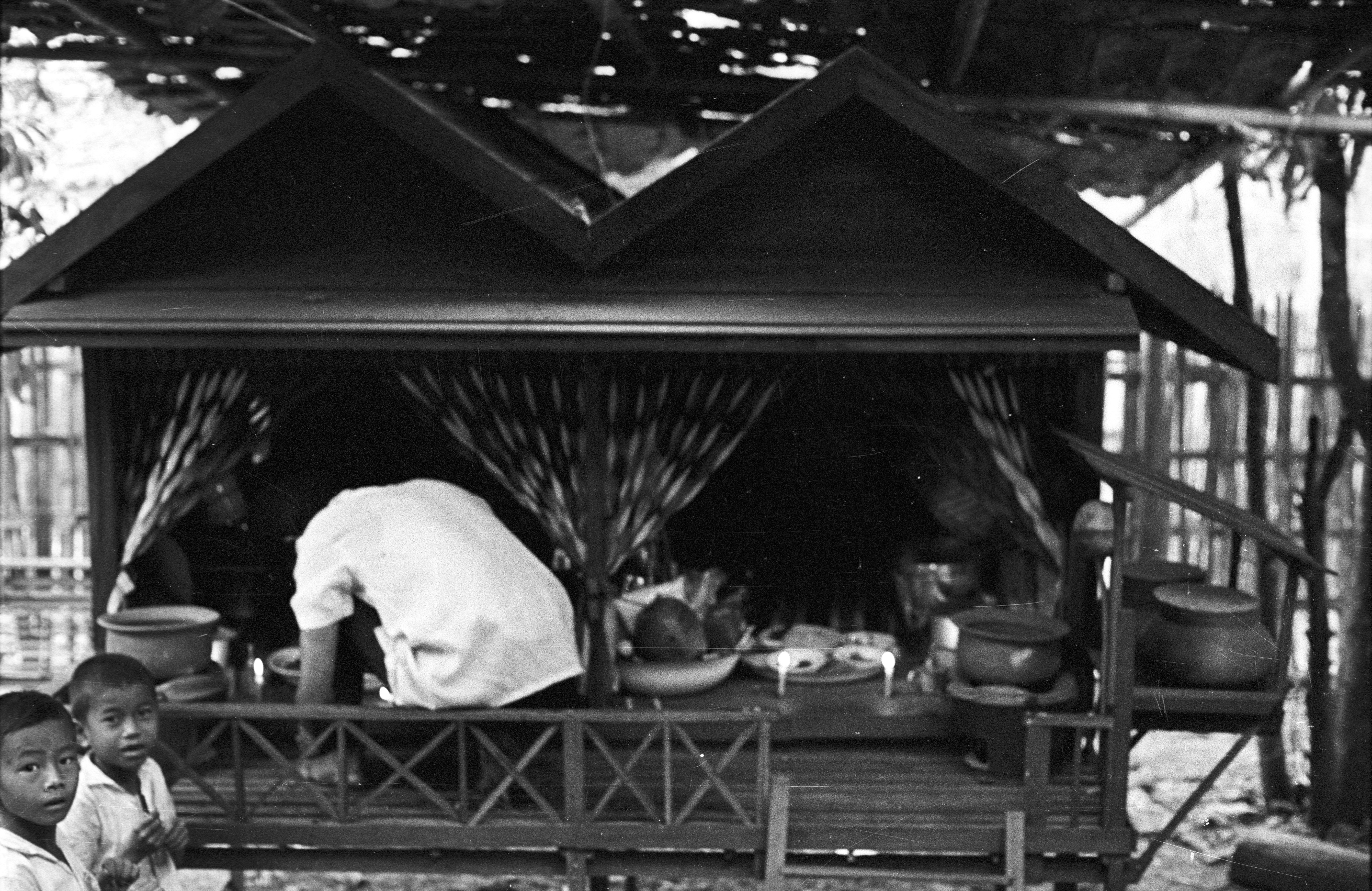 Pôi Khao Sang (rite of offering house and goods to make merit for a deceased person) at B. Phae, Com Caeng: little house, 2 photos; abbot reading sermon in little house, 2 photos; relative in little house with abbot, 1 photo; family in front of little house, 3 photos , Amphoe Mae Sariang, Changwat Mae Hong Son, Thailand, March 1968