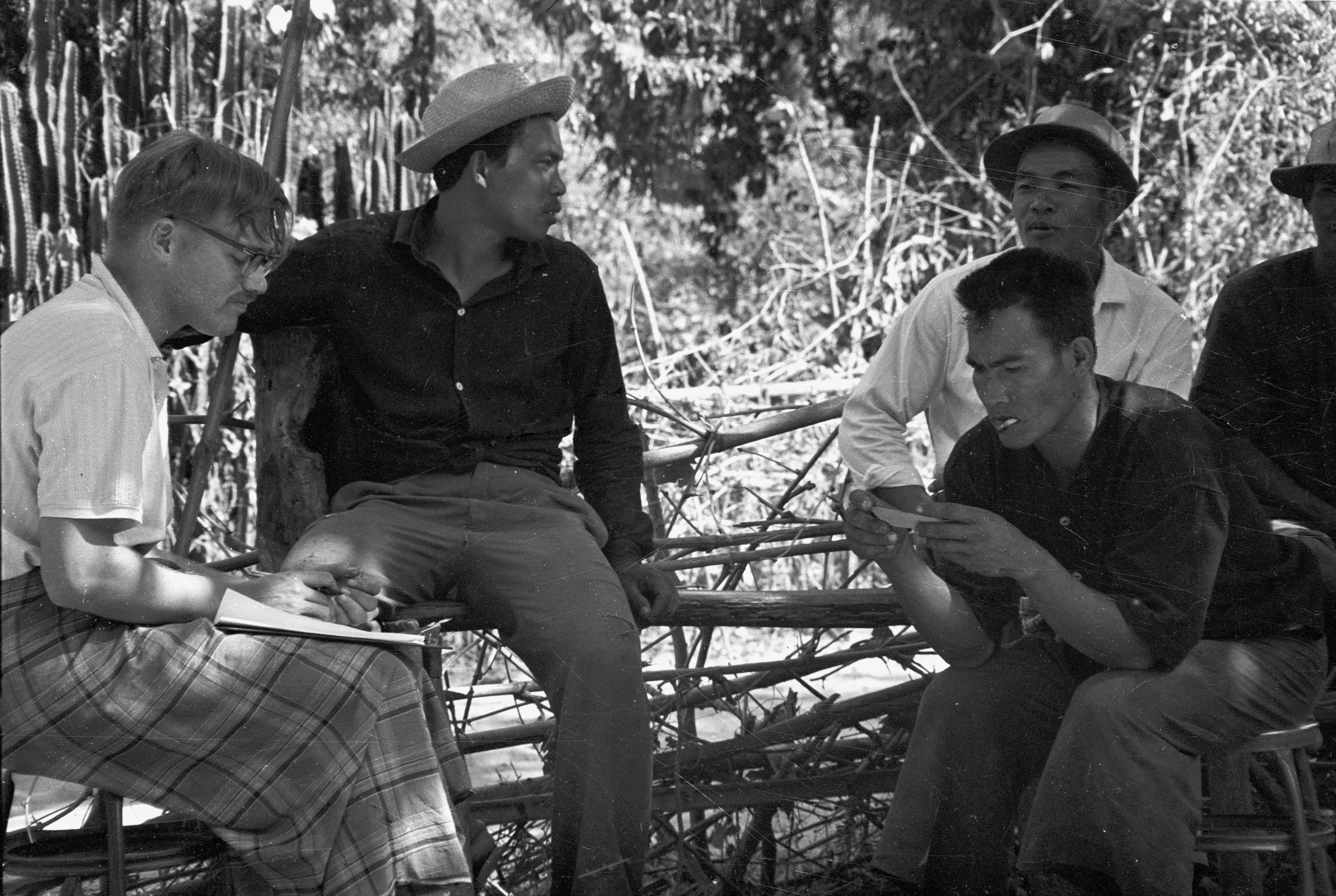 Charles F. Keyes and village man talking to men, Changwat Maha Sarakham, Thailand, January 1964
