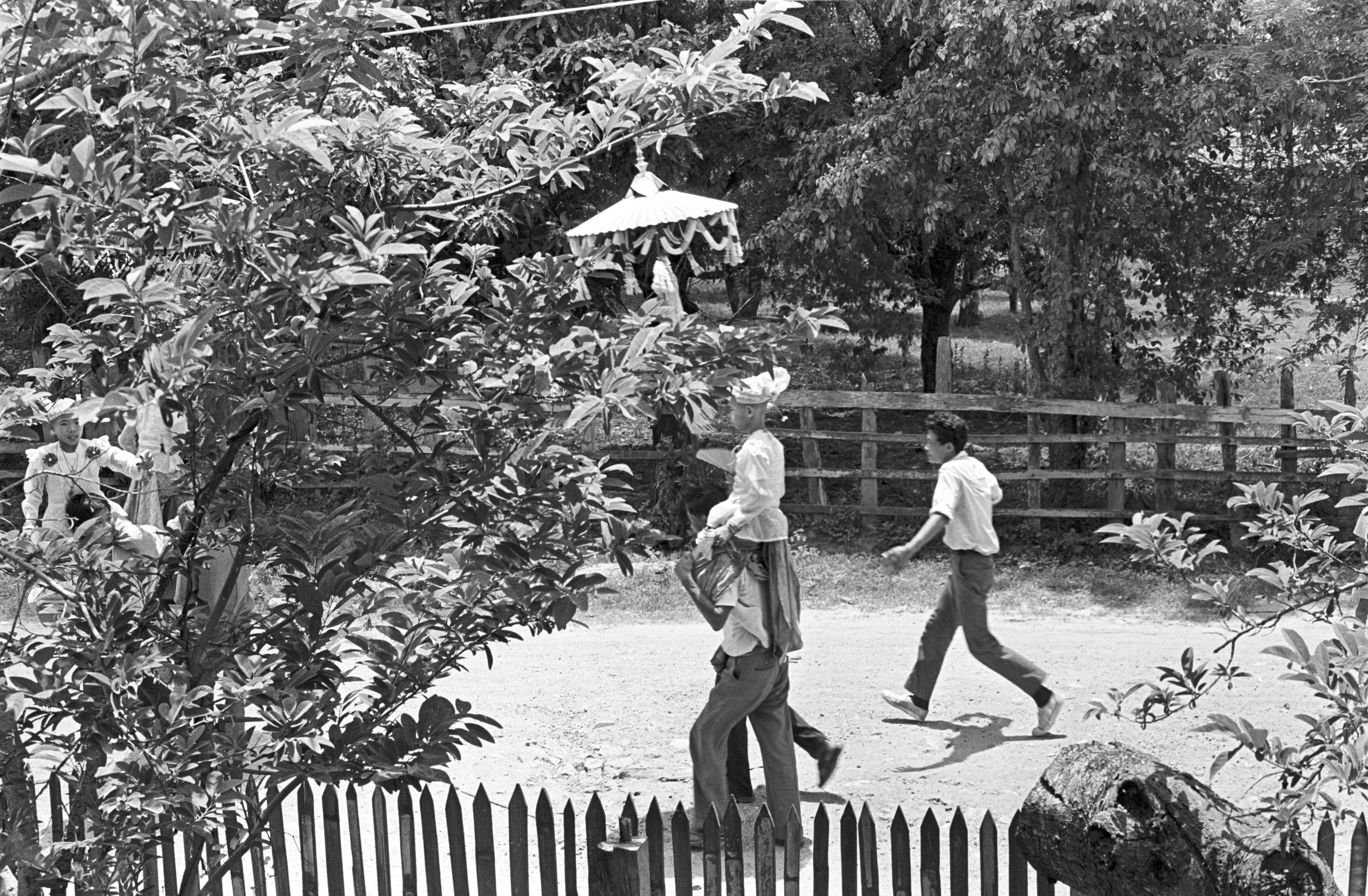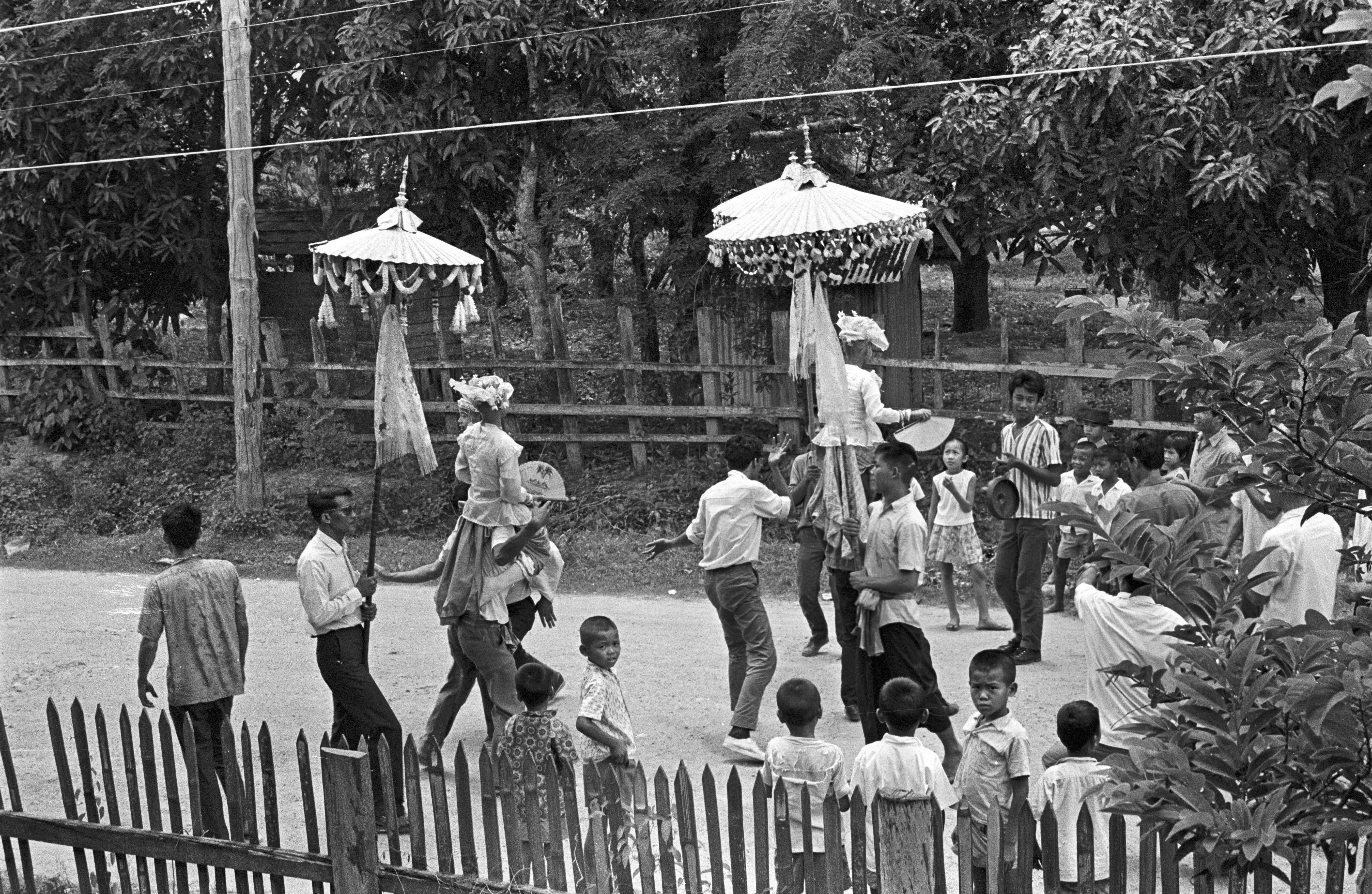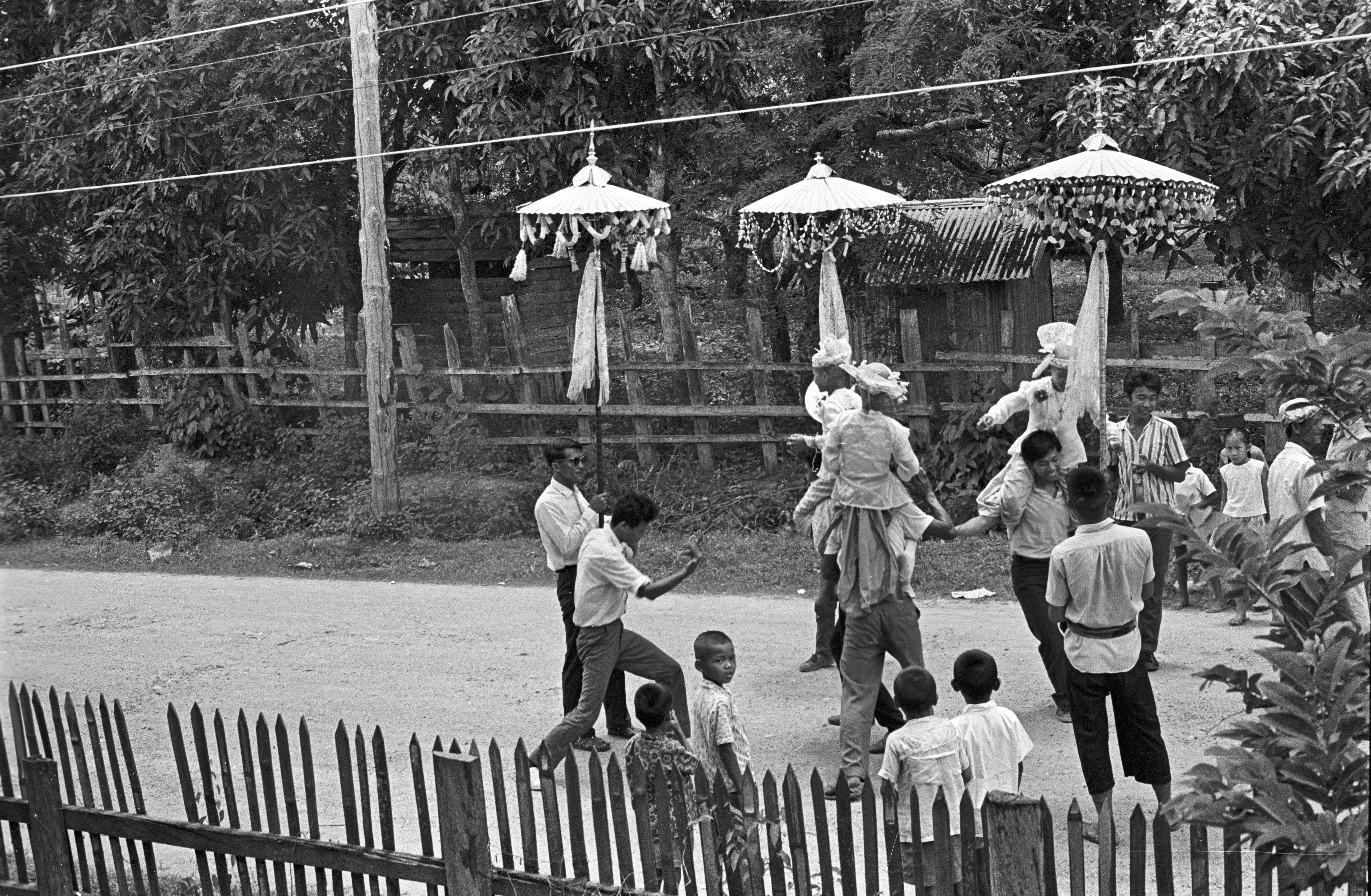 Procession and arrival at Wat Ommarawat of “jewel children” (lūk kāēo): boys who are candidates for ordination as novices at Wat Ommarawat, 8 photos, Amphoe Mae Sariang, Changwat Mae Hong Son, Thailand, May 1968
