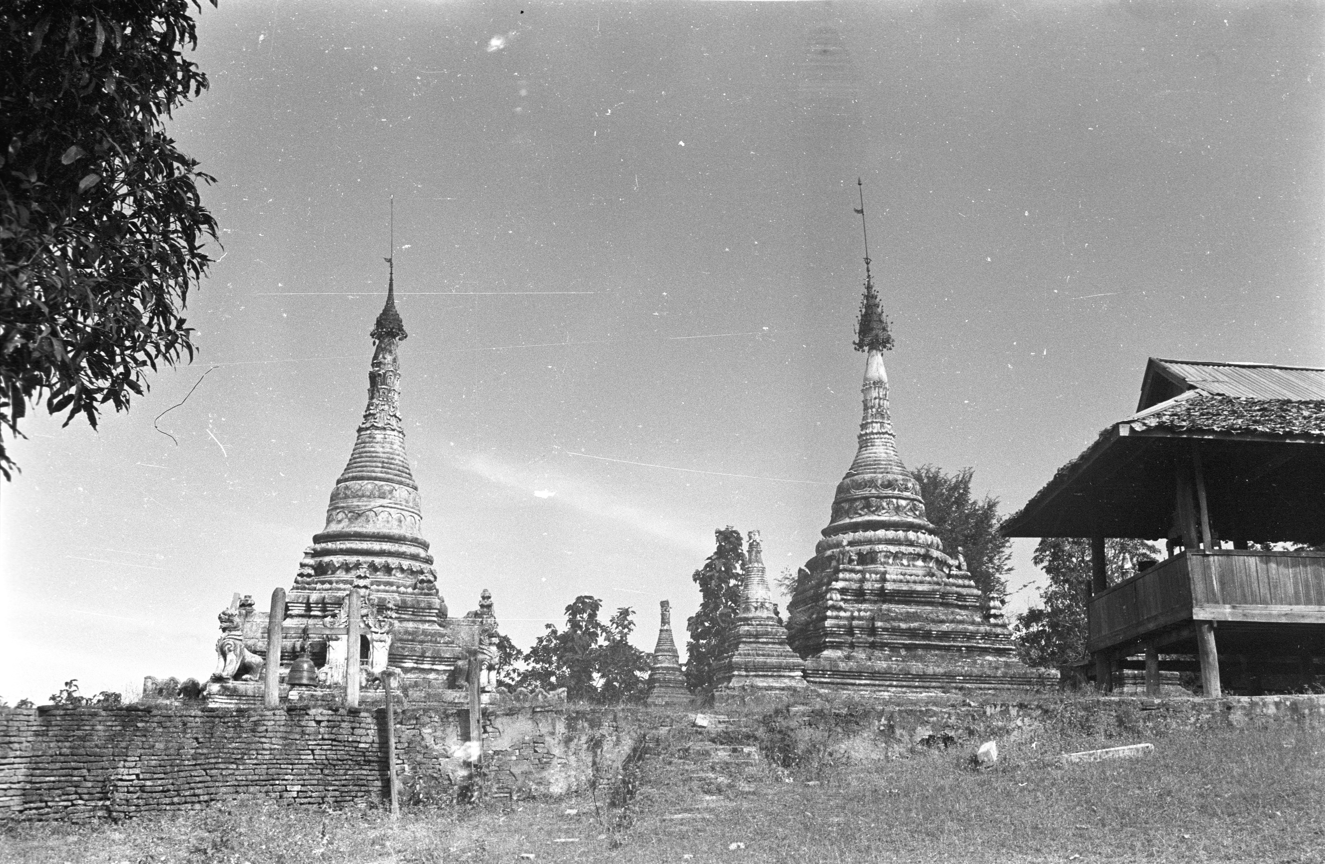 Wat Côm Thông -- chēdī and parts of a chēdī, Buddha image in base of chēdī, 4 photos, Mae Hong Son Province, Thailand, November 1967