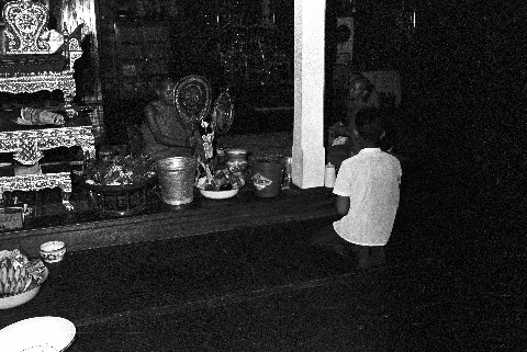 Songkran at Wat Kittiwong: layman receiving blessing, Amphoe Mae Sariang, Changwat Mae Hong Son, Thailand, April 1968