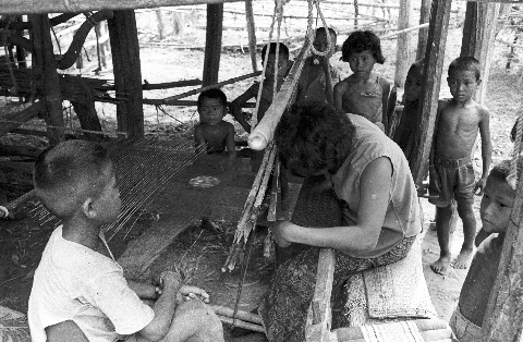 Woman weaving, 2 photos, Ban Nong Tun, Amphoe Muang Maha Sarakham, Changwat Maha Sarakham, Thailand, May 1968