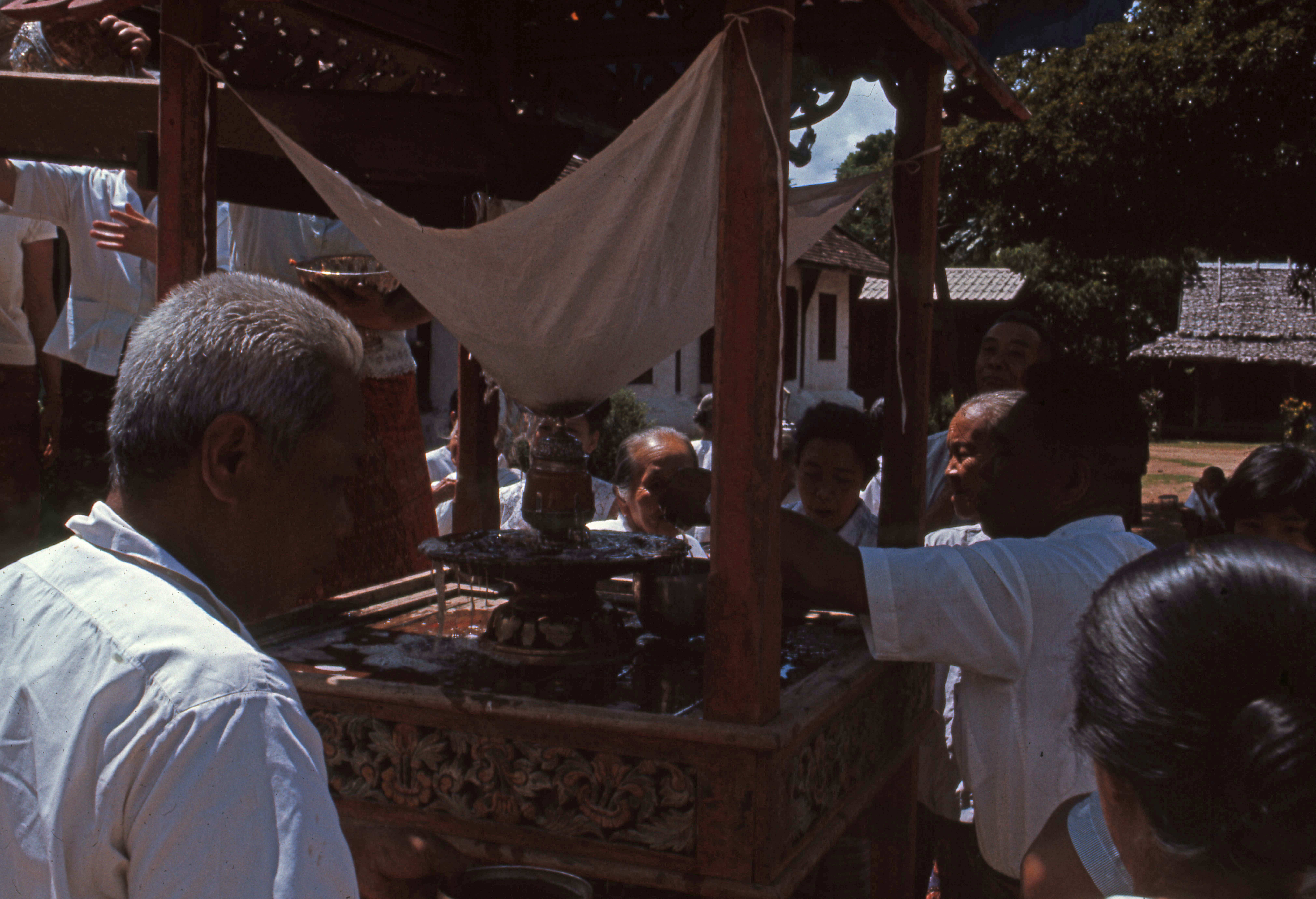 End of lent at Wat Kittiwong – bathing relic, 4 photos; laymen carrying relic, 1 photo, Amphoe Mae Sariang, Changwat Mae Hong Son, Thailand, October 1968