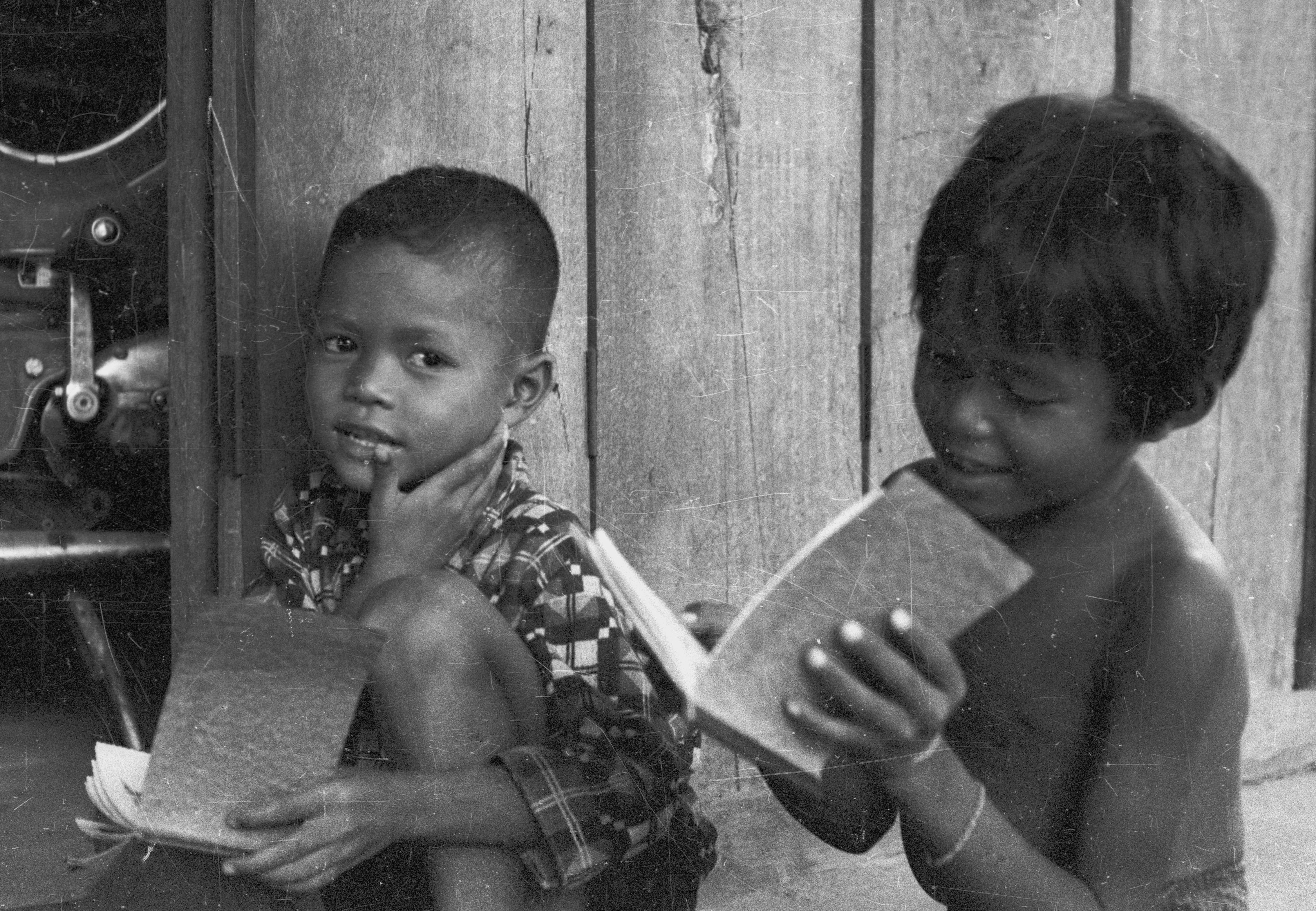 Two children looking at photos, Ban Nong Tun, Amphoe Muang, Changwat Maha Sarakham, Thailand, May 1963