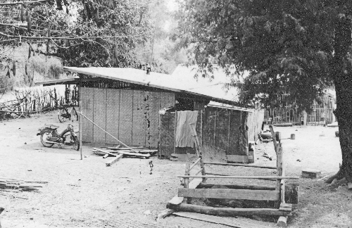 Side view of our house and motorcycle, with pig pen, Changwat Maha Sarakham, Thailand, March 1964