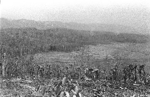 S'gaw Karen village: view of valley from hill where new stupa is located, Ban Mae Top Nuea, Amphoe Mae Sariang, Changwat Mae Hong Son, Thailand, March 1968