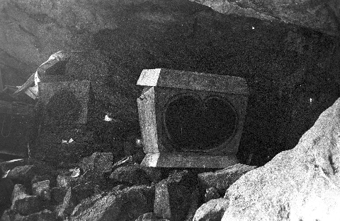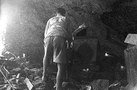Teak box in which palm leaf manuscripts were found; Tu', Čao Khana Amphoe's assistant at teak box in which palm leaf manuscripts were found; 2 photos, Pa Daeng Cave, Amphoe Mae Sariang, Changwat Mae Hong Son, Thailand, June 1968