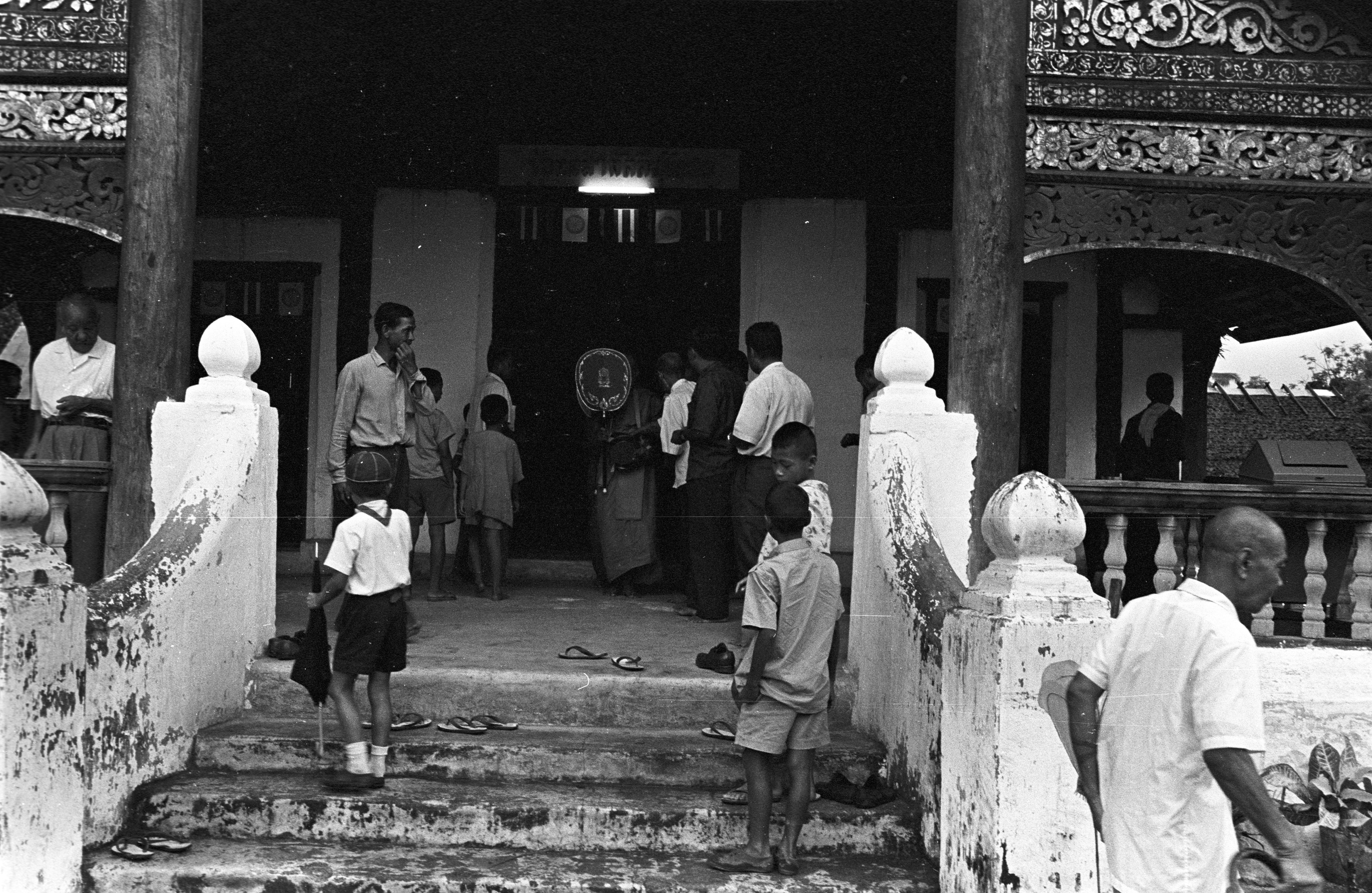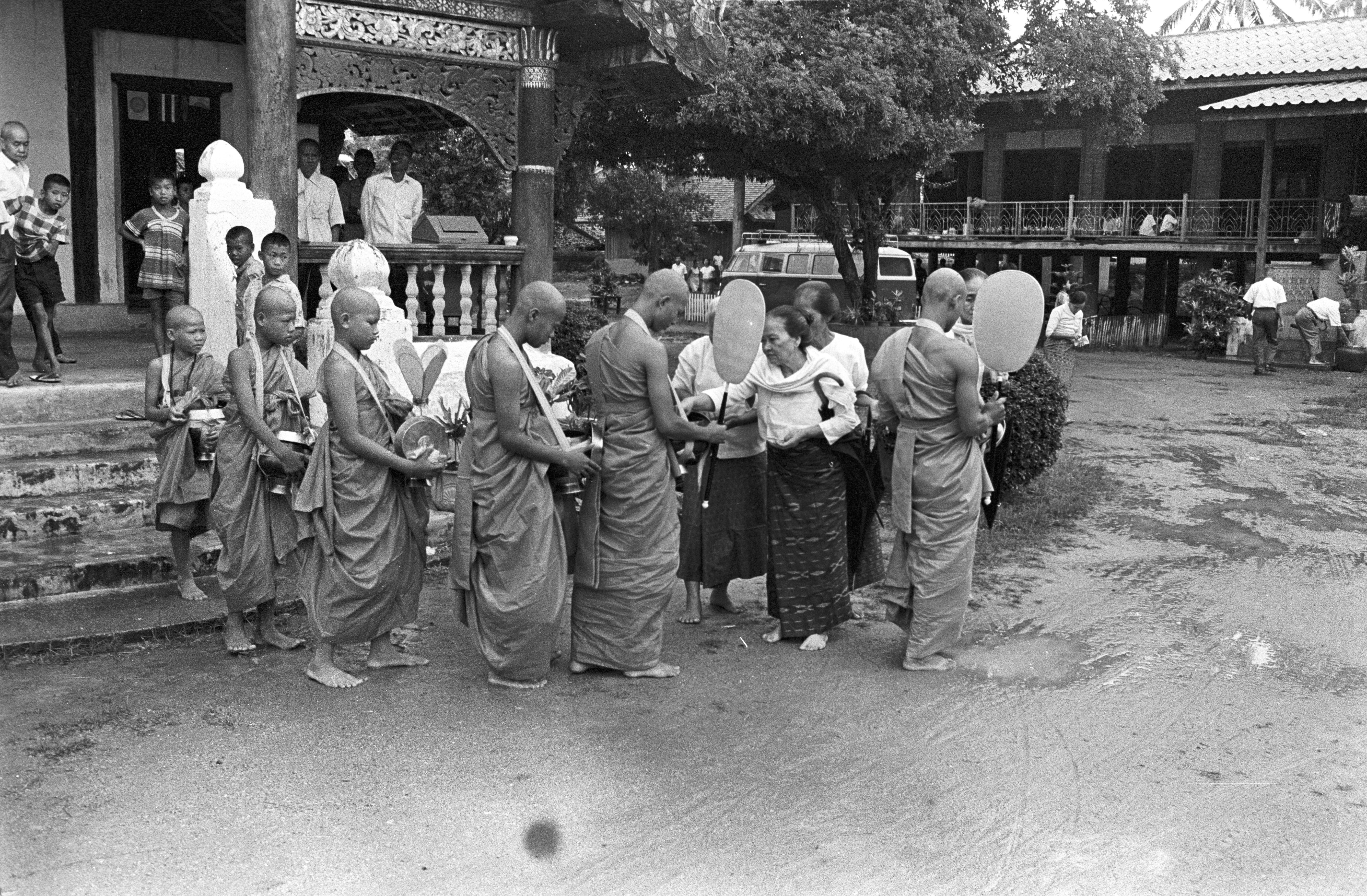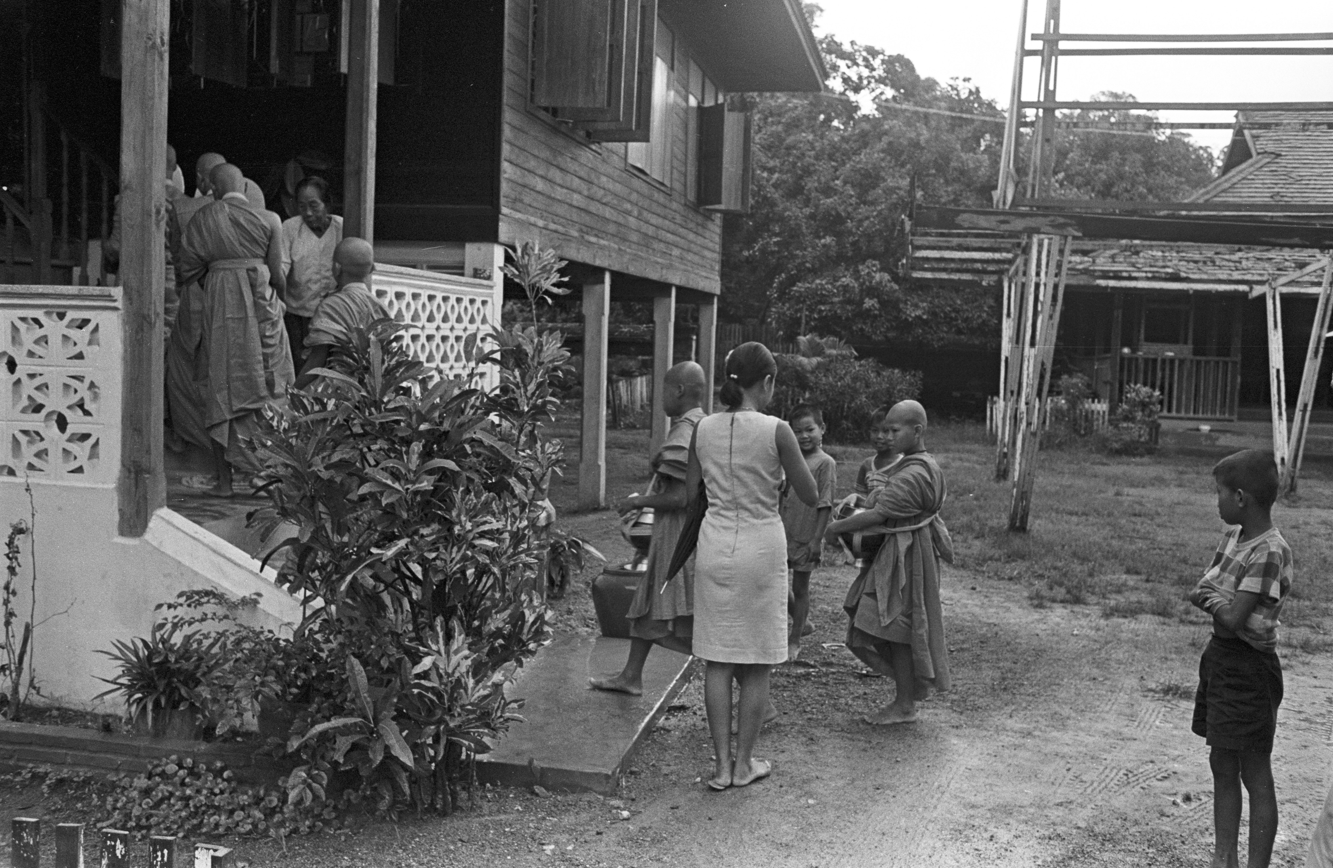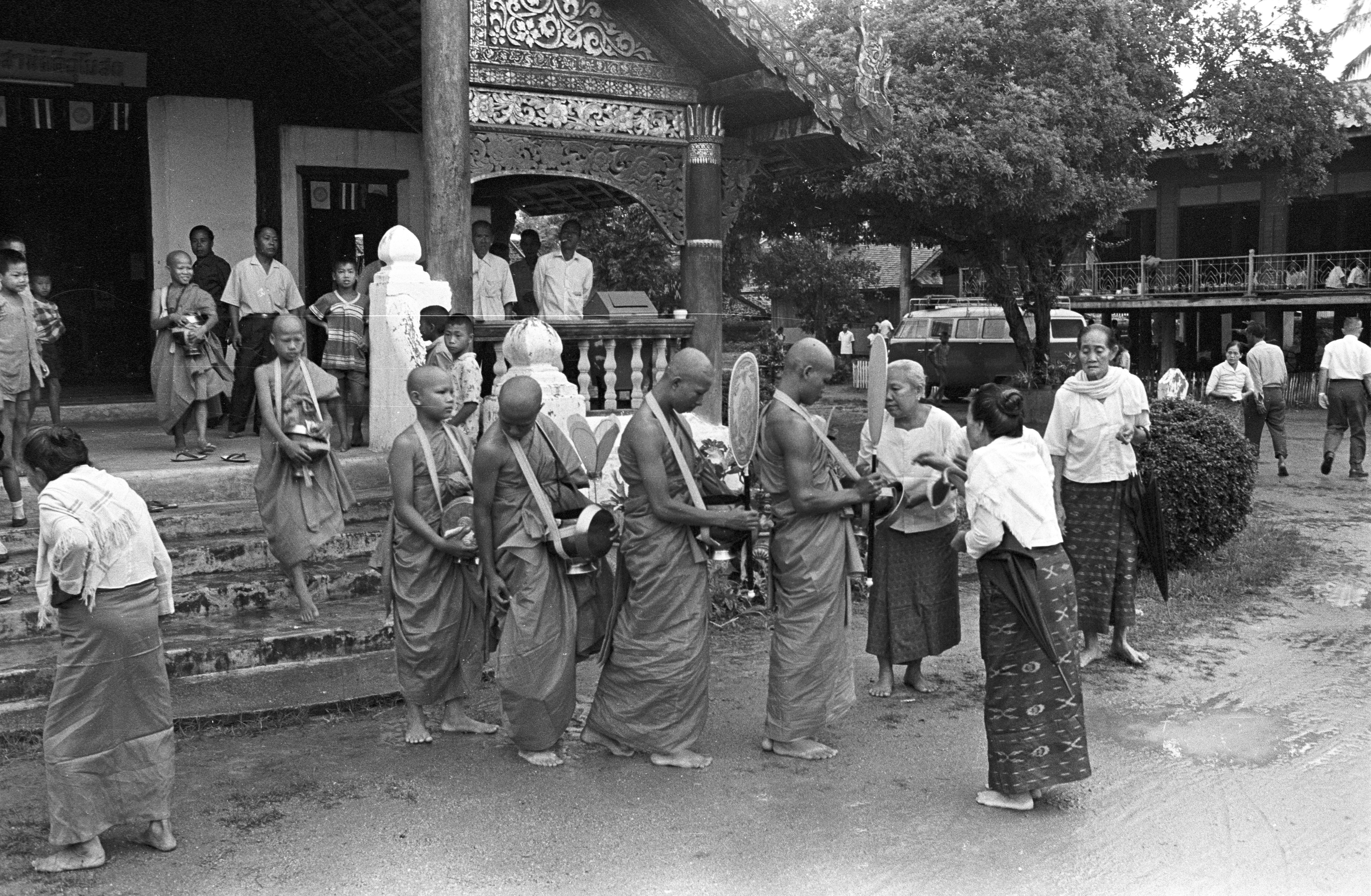 Wat Kittiwong: ordination -- new monks and novices emerging to receive alms for first time, 5 photos; new monks and novices inside kuthi with gifts, 1 photo, Amphoe Mae Sariang, Changwat Mae Hong Son, Thailand, July 1968
