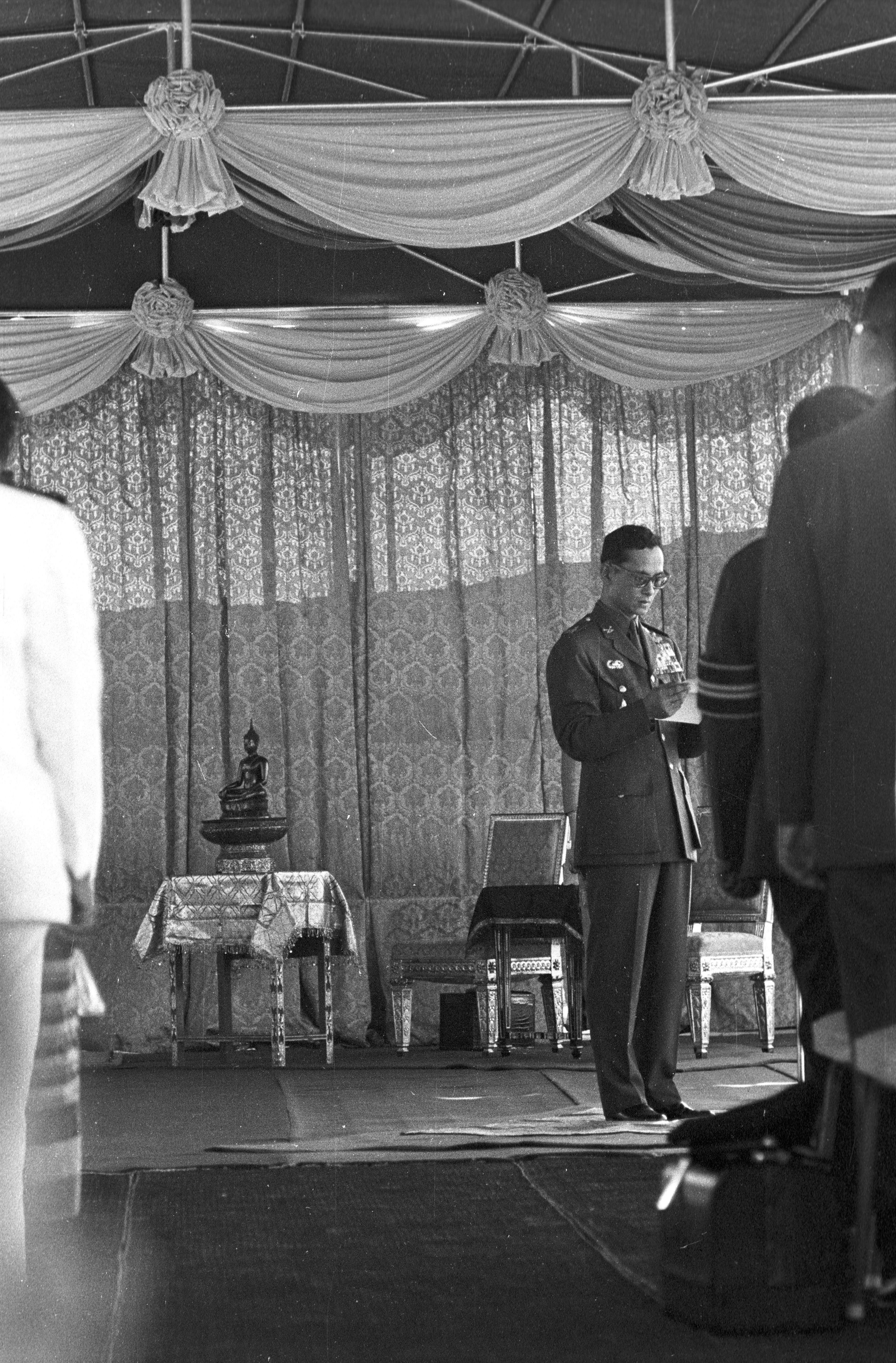 Ceremony at which King Bhumipol dedicated a royally-cast Buddha image as the palladium of the province – King on dais, 3 photos; King and Queen on dais, 3 photos, Amphoe Muang Mae Hong Son, Changwat Mae Hong Son, Thailand, January 1968