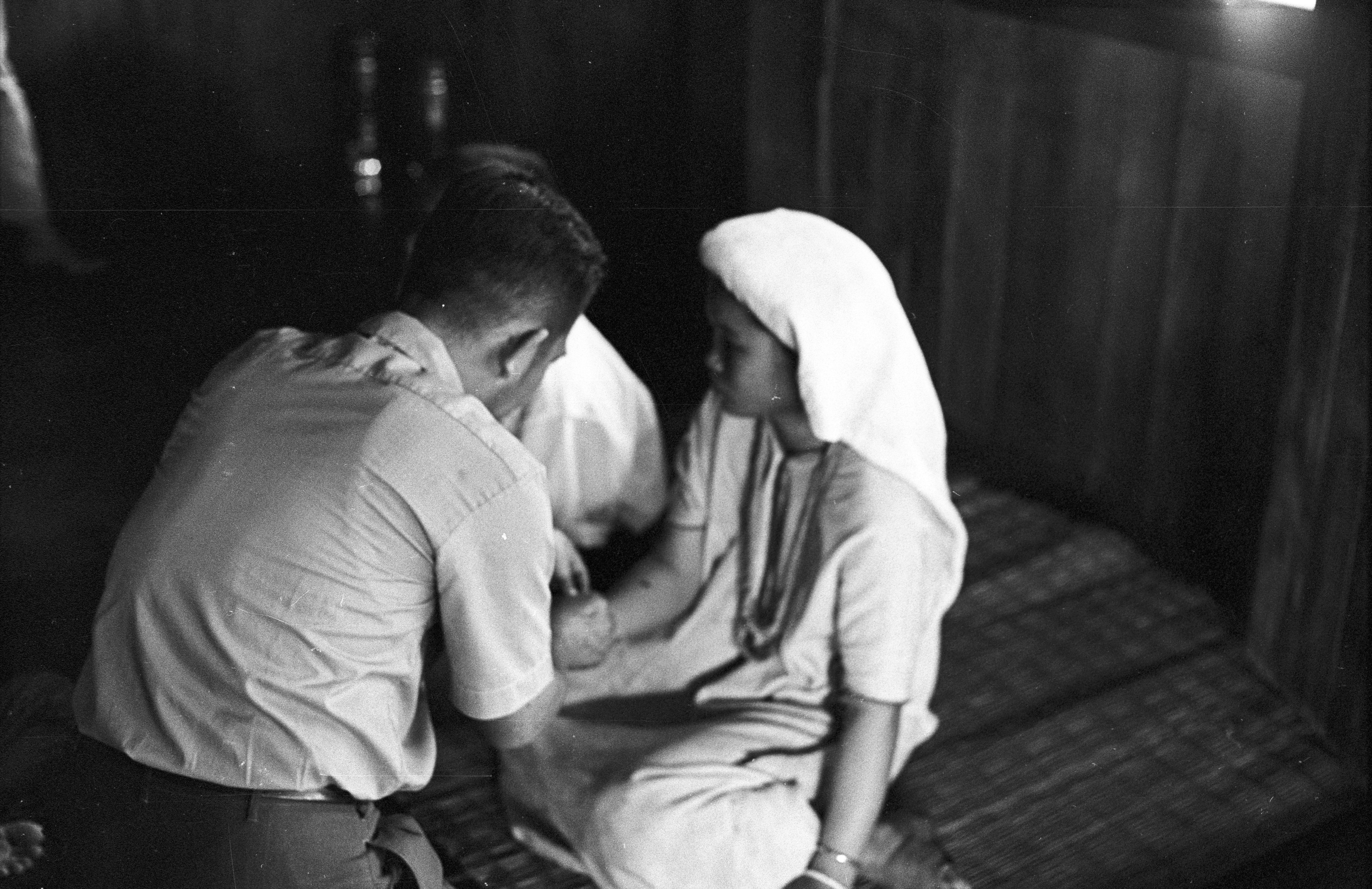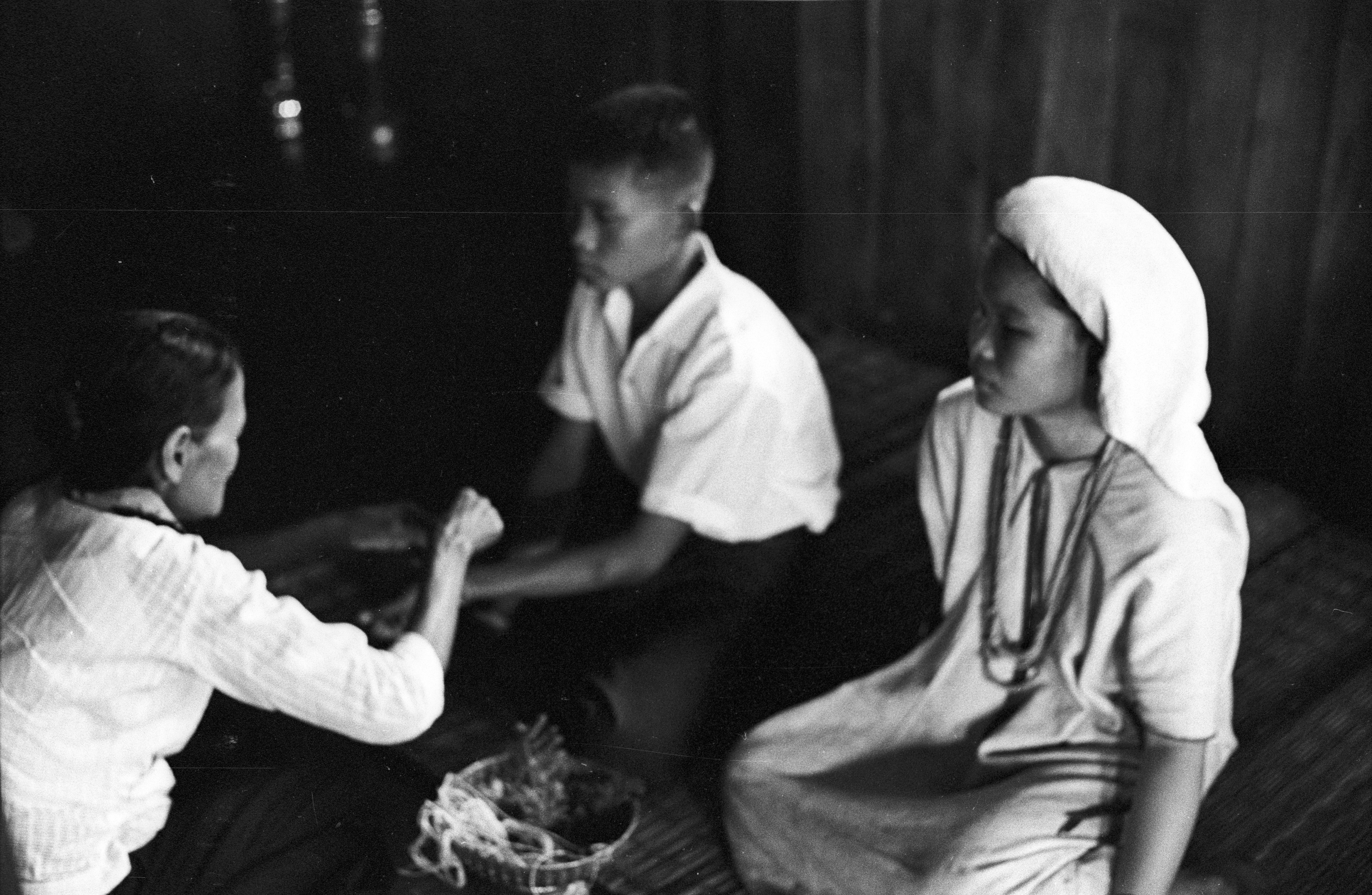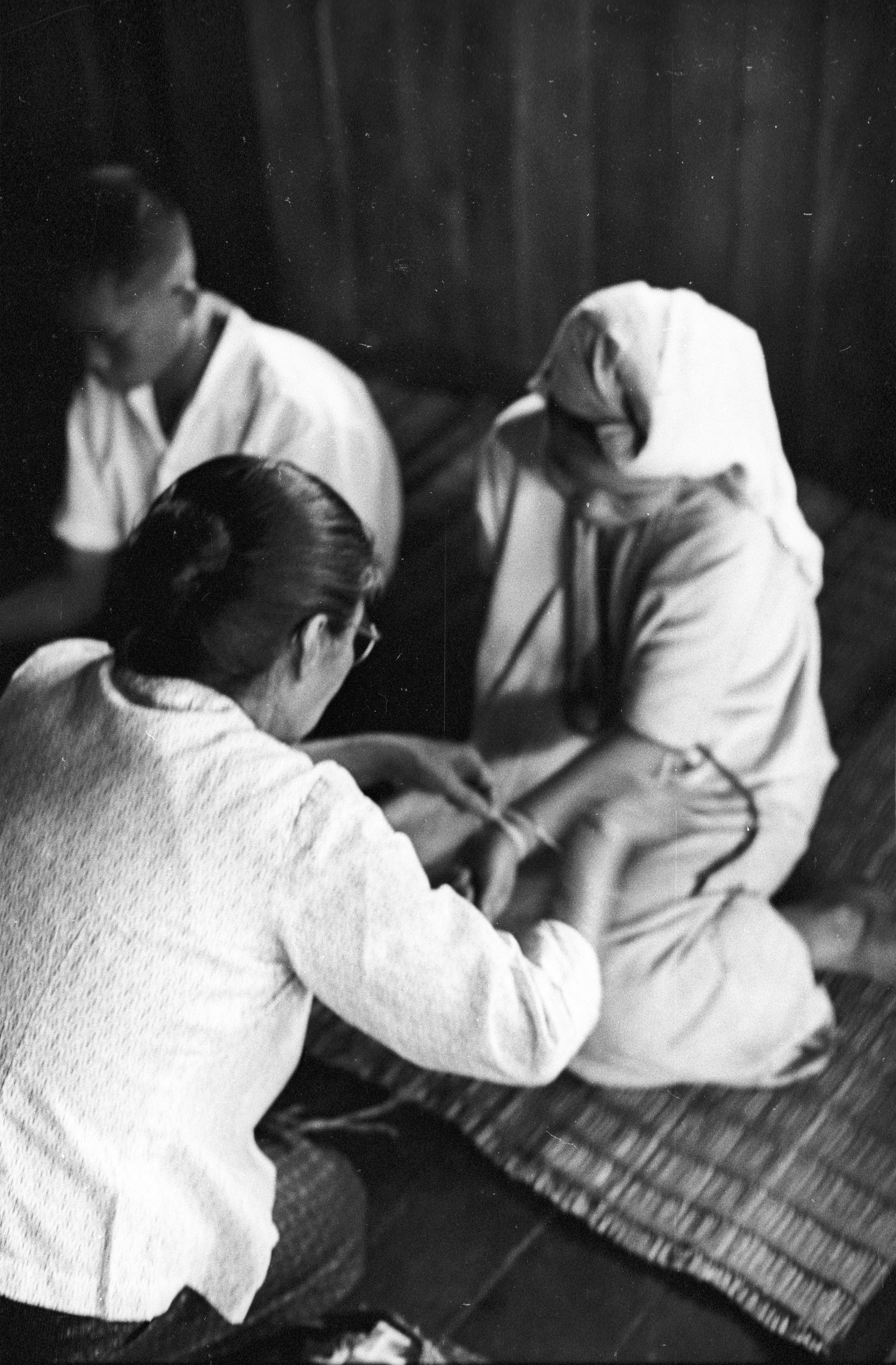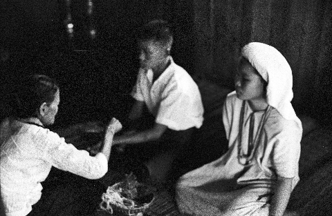 Wedding in a Karen village: Thai woman tying wrist of bride, 2 photos; Thai man tying wrist of bride, 1 photo, Ban Phae, Amphoe Mae Sariang, Changwat Mae Hong Son, Thailand, January 1968