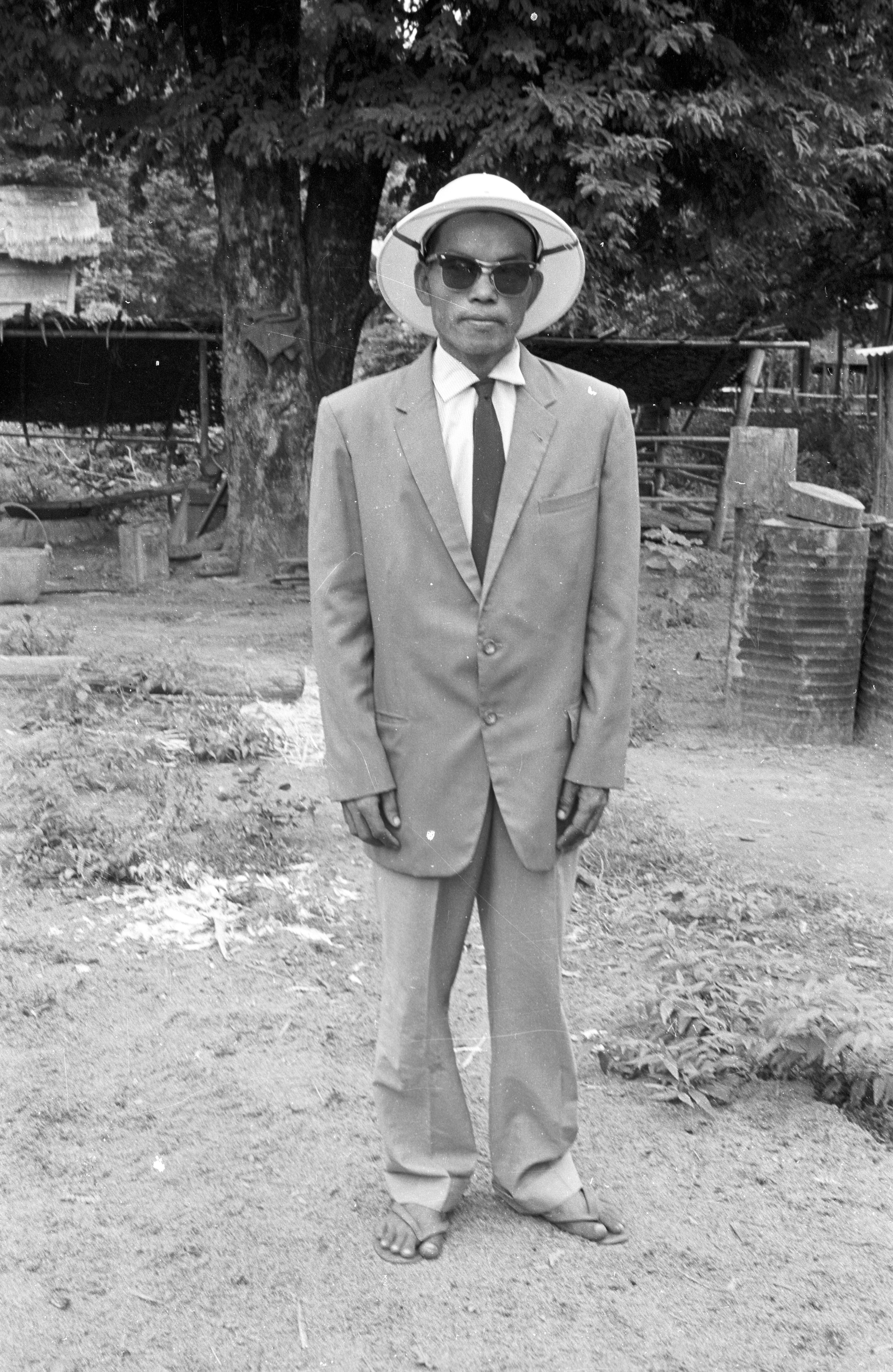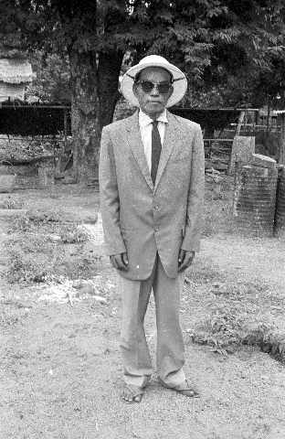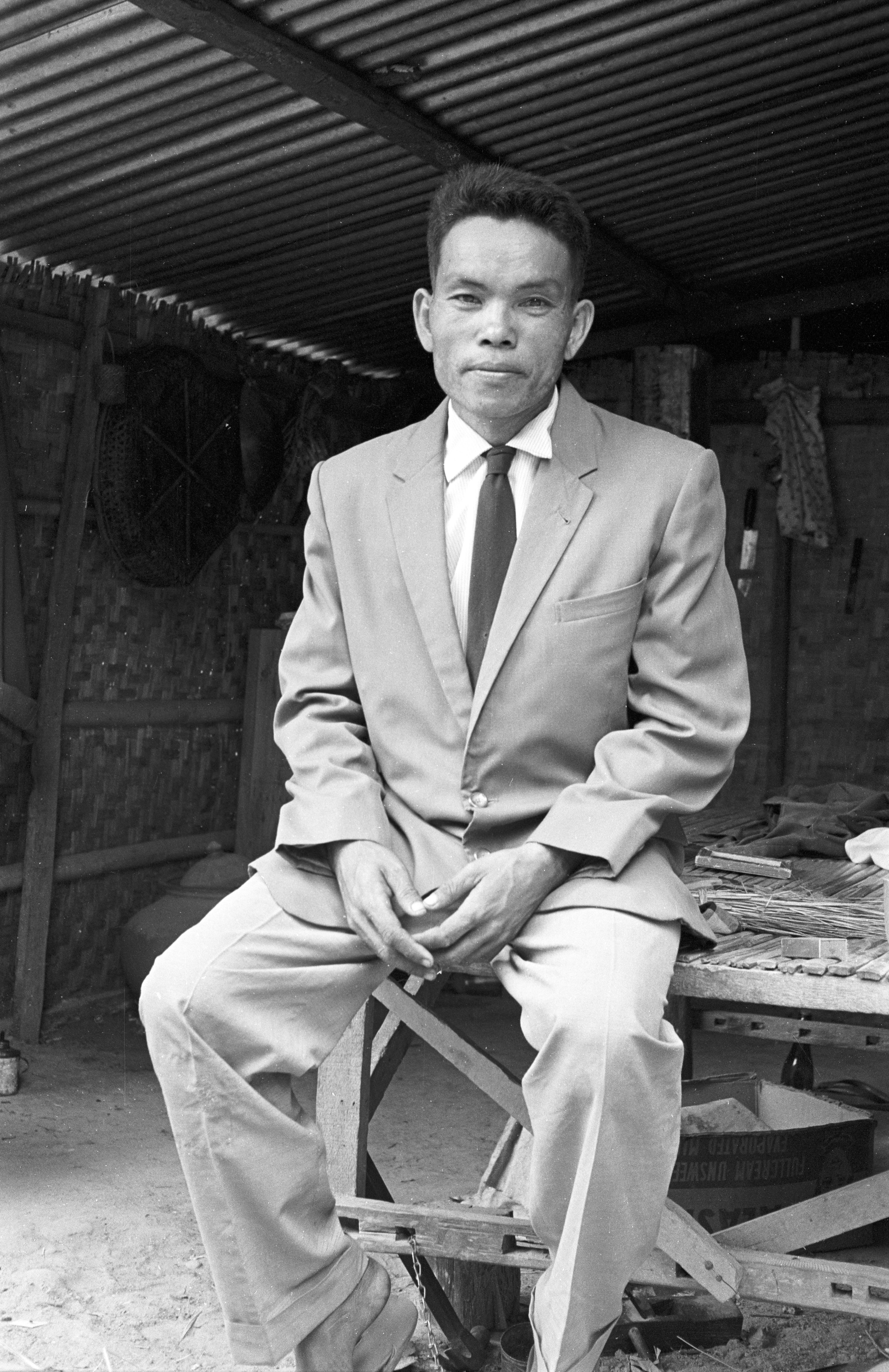 Village man in suit sitting in front of house, 2 photos, Ban Nong Tun, Amphoe Muang, Changwat Maha Sarakham, Thailand, September 1963