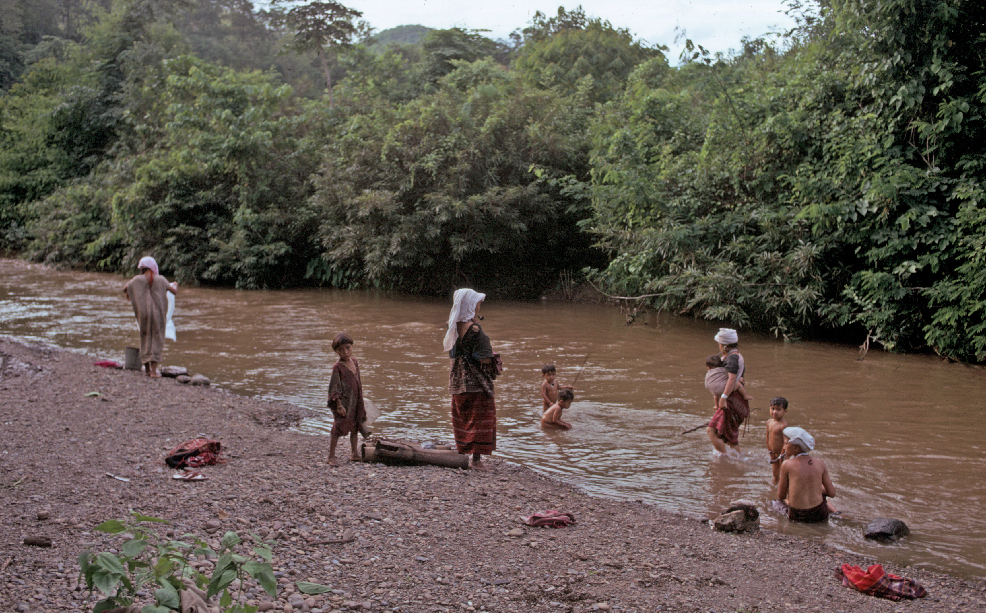 Trip to Salween to find old palm leaf manuscripts (bailān) -- bathing in river at Bān Māē Ngae, Karen village, 2 photos, Thambon Ban Kat, Amphoe Mae Sariang, Changwat Mae Hong Son, Thailand, June 1968