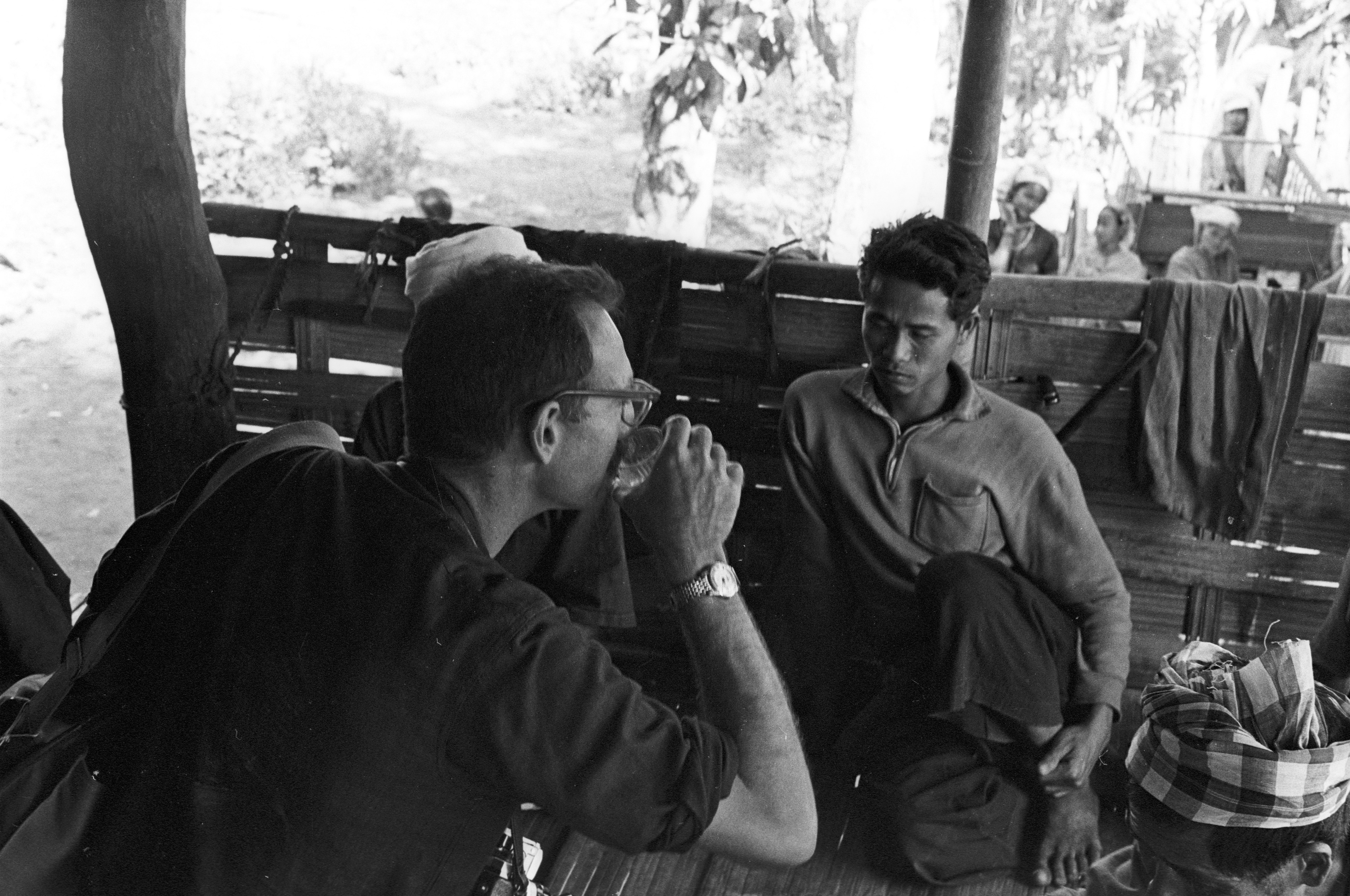 Wedding in a Karen village: Peter Kunstadter drinking, Ban Phae, Amphoe Mae Sariang, Changwat Mae Hong Son, Thailand, January 1968