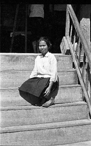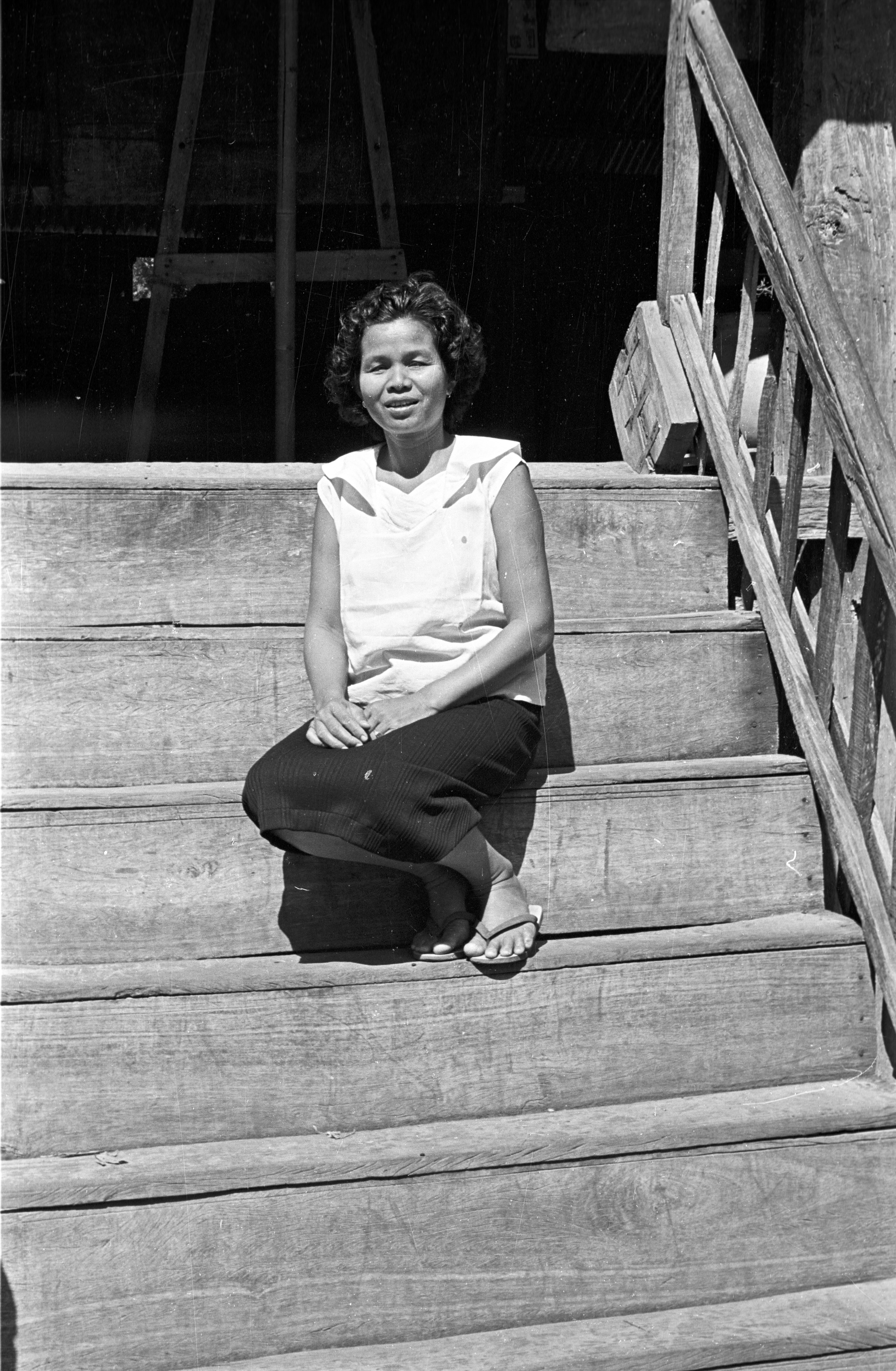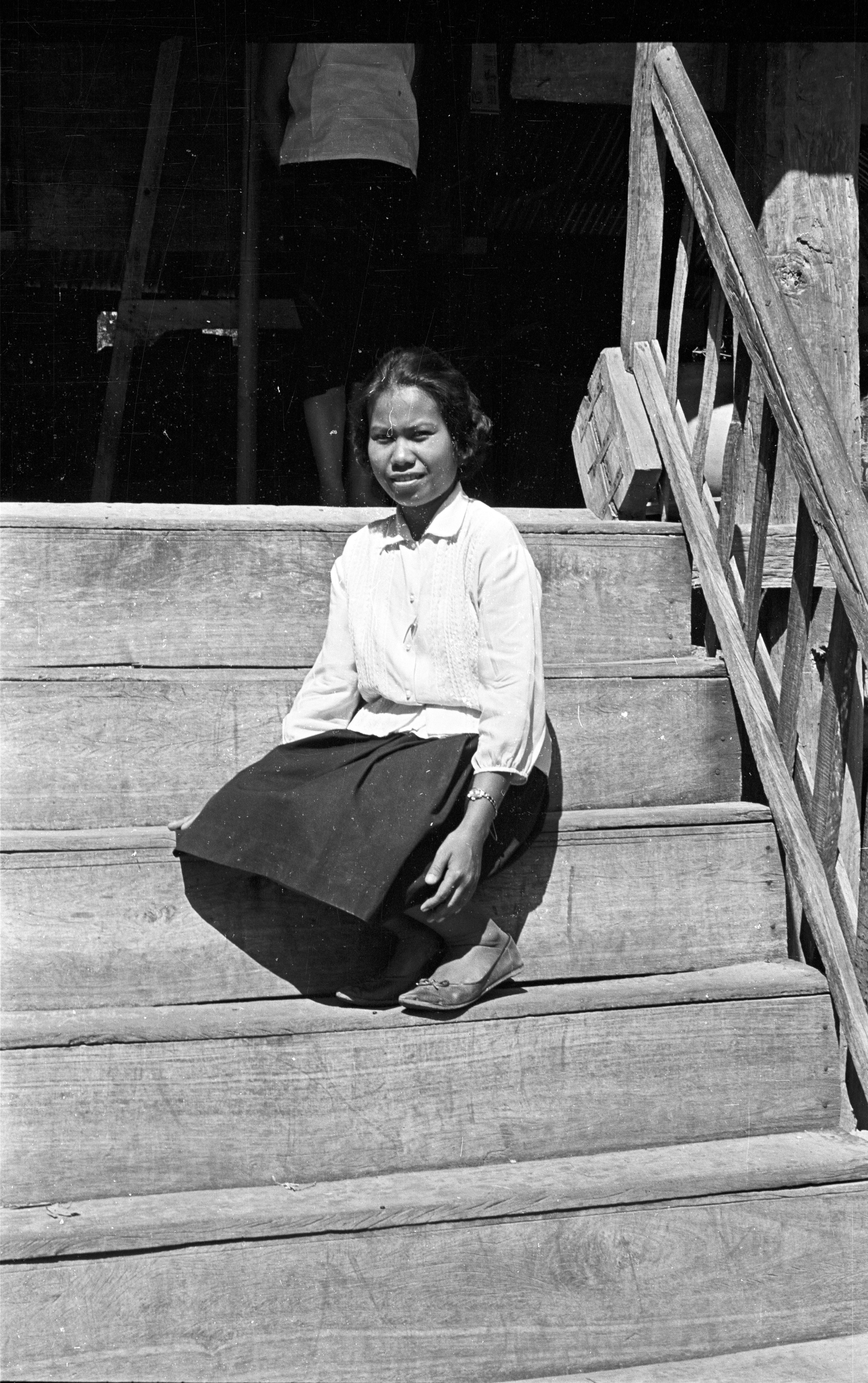Khrū (teacher) on steps of school, 2 photos, Changwat Maha Sarakham, Thailand, January 1964