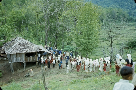 Ordination of Karen novices – villagers walking down hill from stupa after ritual is completed; Cao Khana Amphoe, new novices, and villagers on hill below stupa; 2 photos, Ban Pa Mak, Thambon Ban Kat, Amphoe Mae Sariang, Changwat Mae Hong Son, Thailand, June 1968