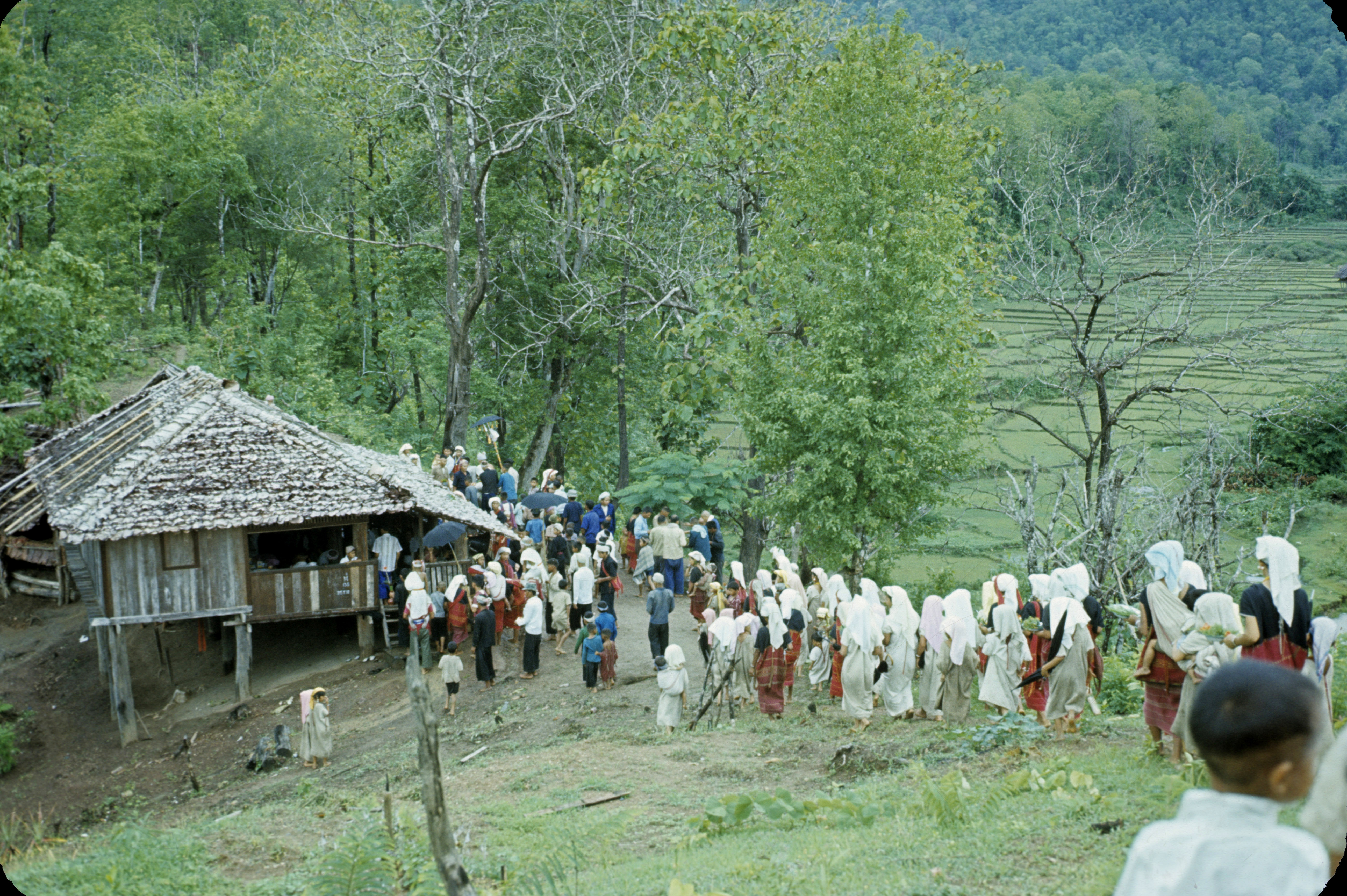 Ordination of Karen novices – villagers walking down hill from stupa after ritual is completed; Cao Khana Amphoe, new novices, and villagers on hill below stupa; 2 photos, Ban Pa Mak, Thambon Ban Kat, Amphoe Mae Sariang, Changwat Mae Hong Son, Thailand, June 1968