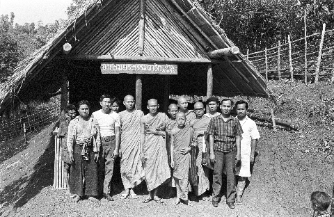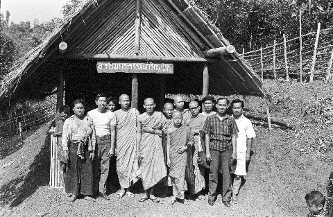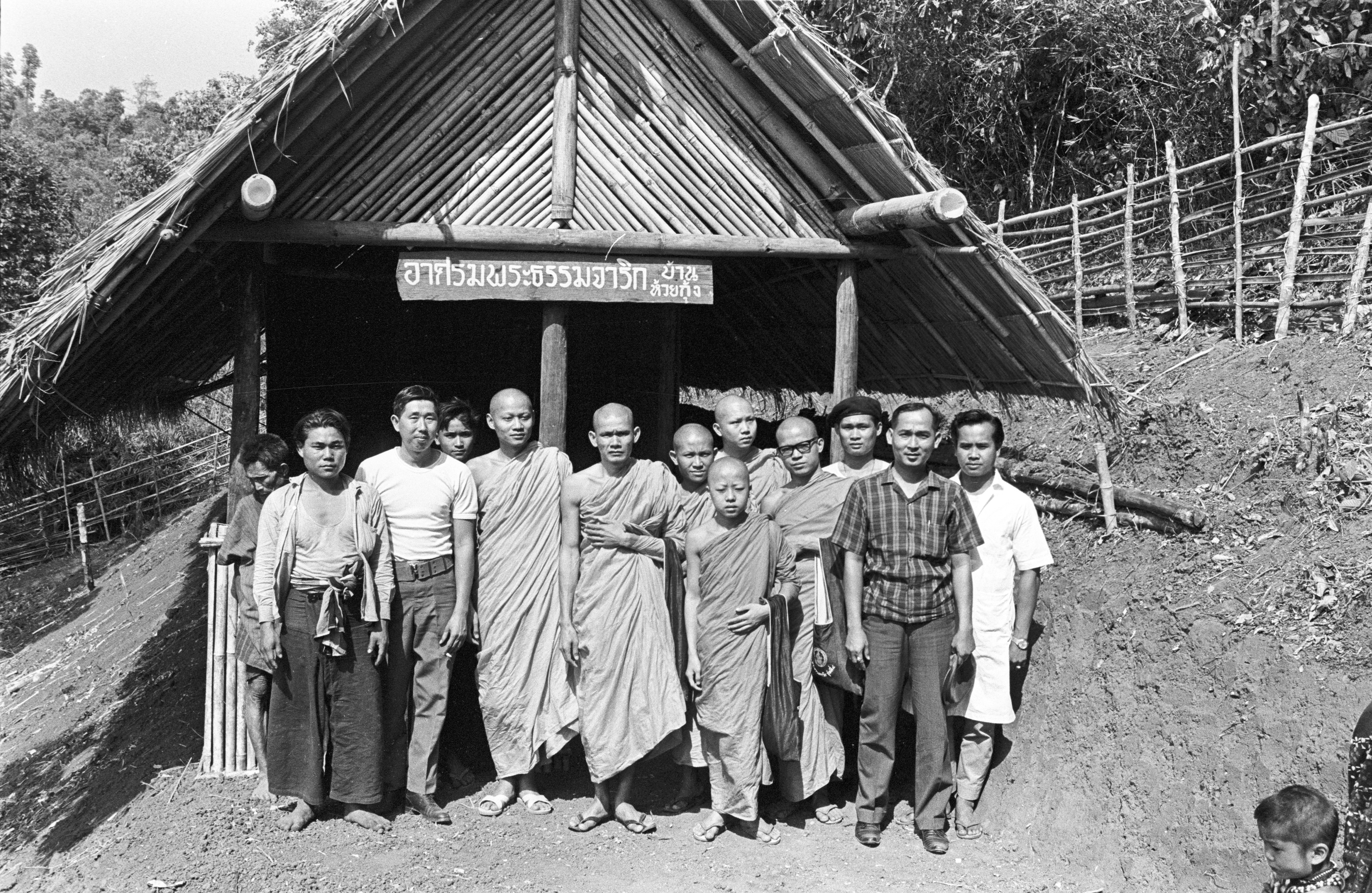 Thammacārik (Buddhist missionary) monks with S'gaw Karen at B. Huai Kung, 2 photos, Thambon Pa Pong, Amphoe Sop Moei, Changwat Mae Hong Son, Thailand, March 1968