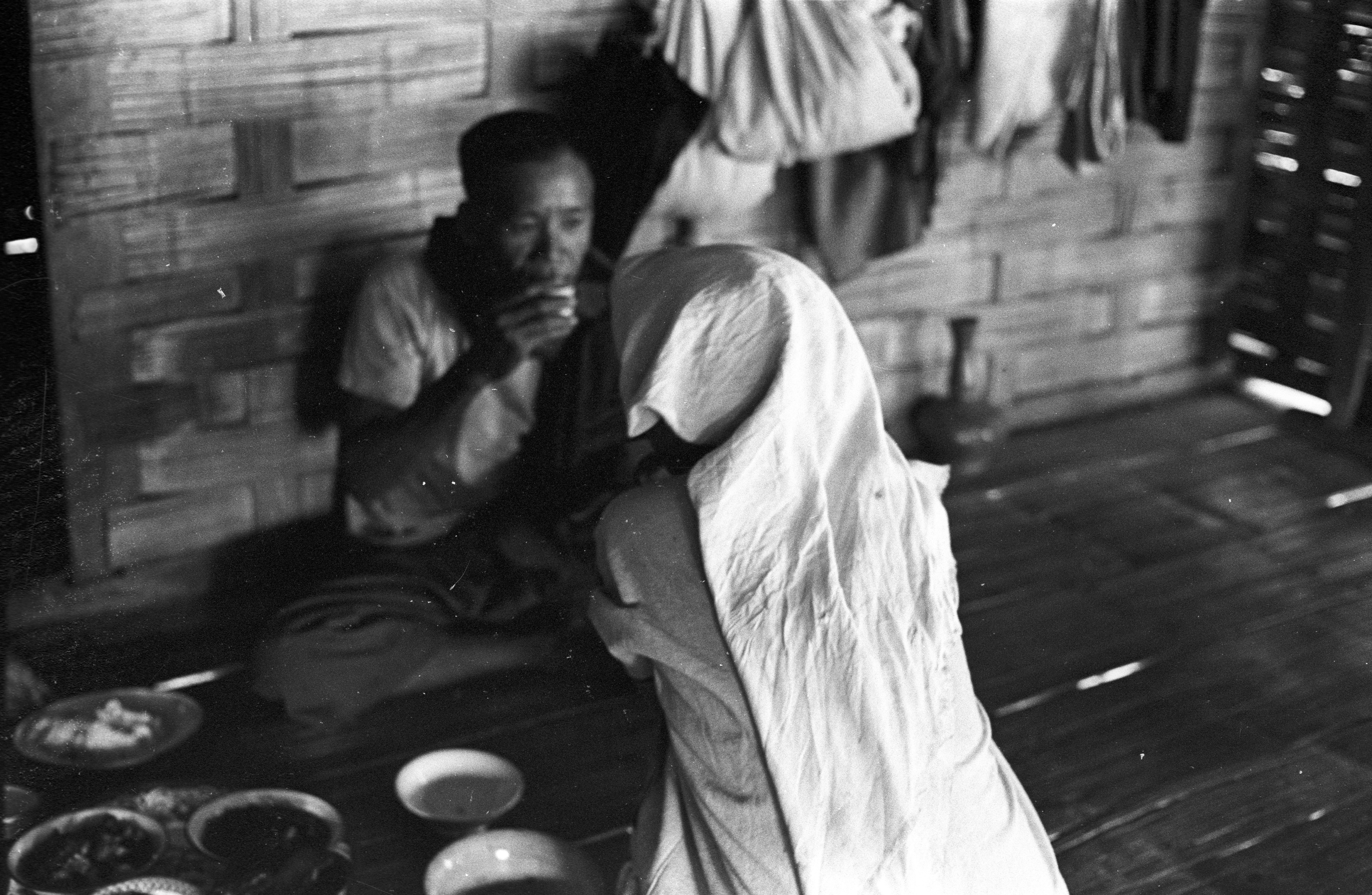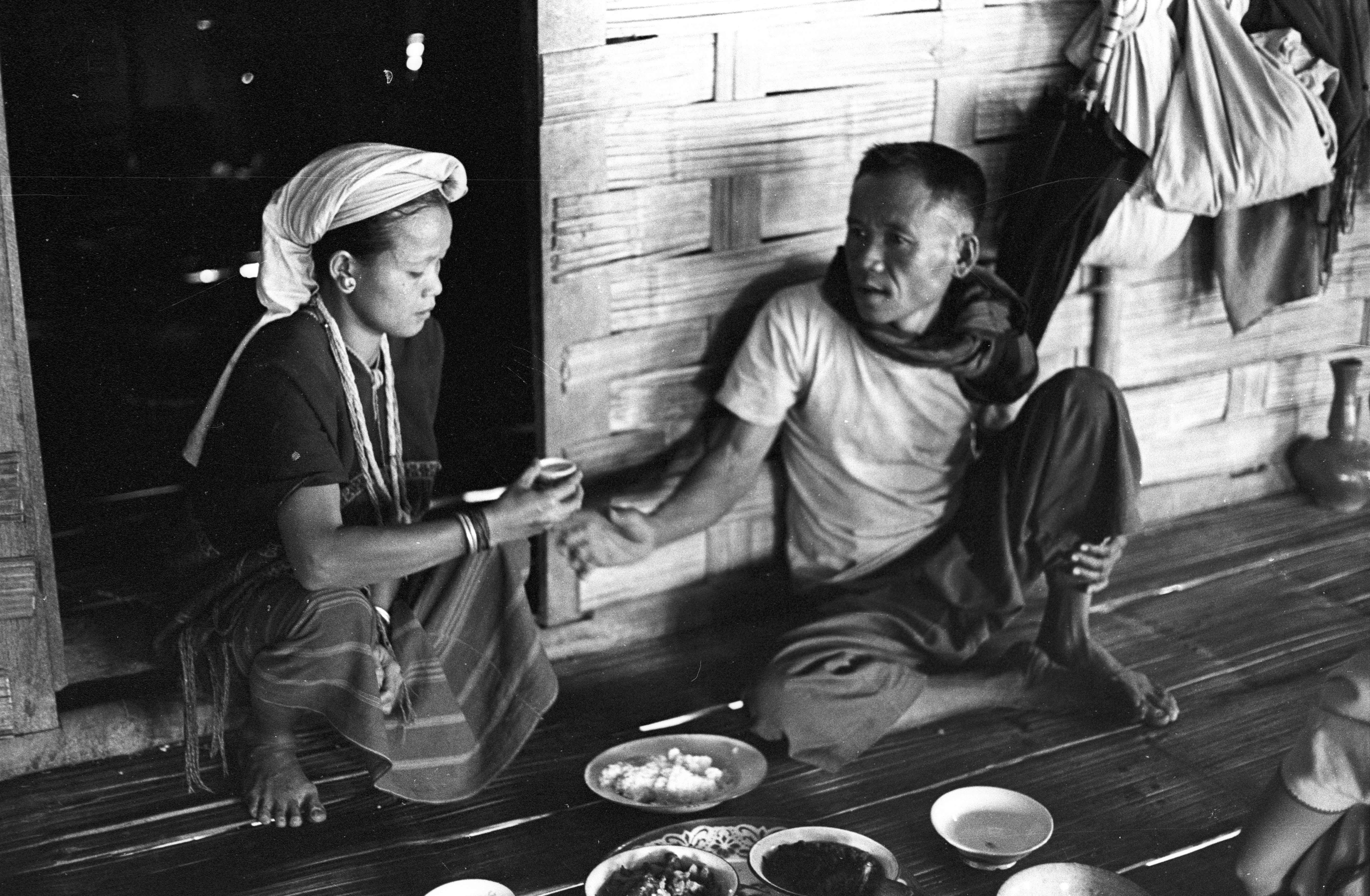 Wedding in a Karen village: male wedding guest drinking in front of woman, male wedding guest being given drink by a married woman, 2 photos, Ban Phae, Amphoe Mae Sariang, Changwat Mae Hong Son, Thailand, January 1968