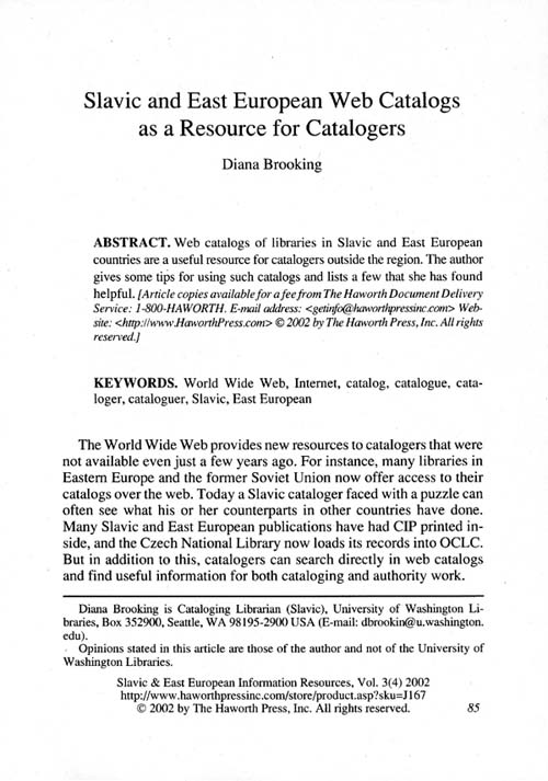 Today a Slavic cataloger faced with a puzzle can often see what their counterparts in Eastern Europe have done by looking at library catalogs now accessible over the World Wide Web.