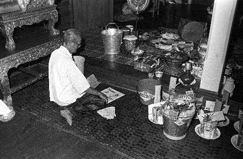 Wat Kittiwong: merit-making for late husband of Mô Amphôn; lay leader beginning ritual, Amphoe Mae Sariang, Changwat Mae Hong Son, Thailand, April 1968