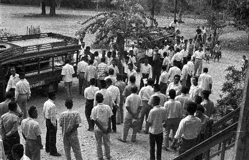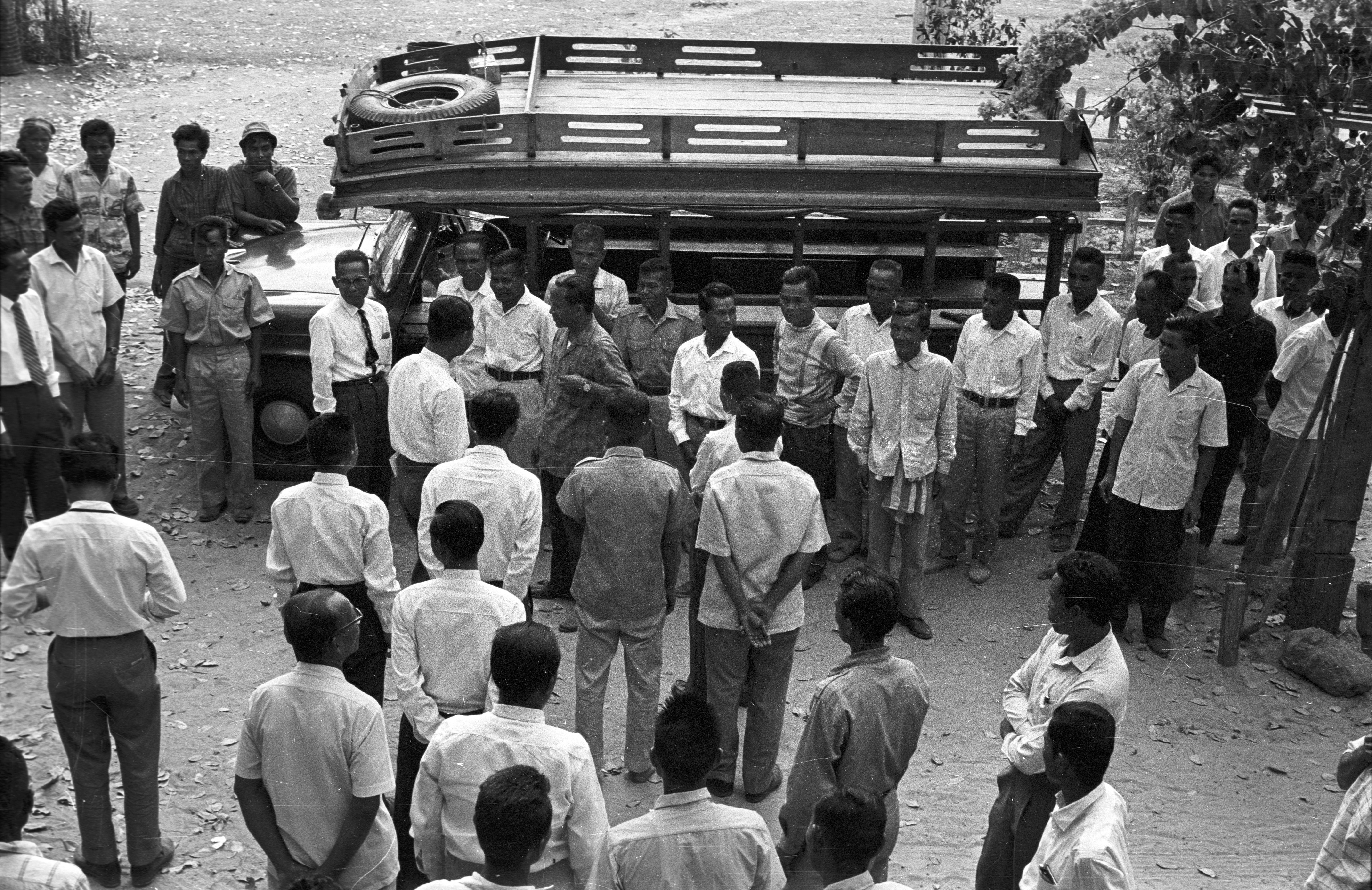 Arrival of group from Ban Bo Phan, 2 photos, Changwat Maha Sarakham, Thailand, January 1964