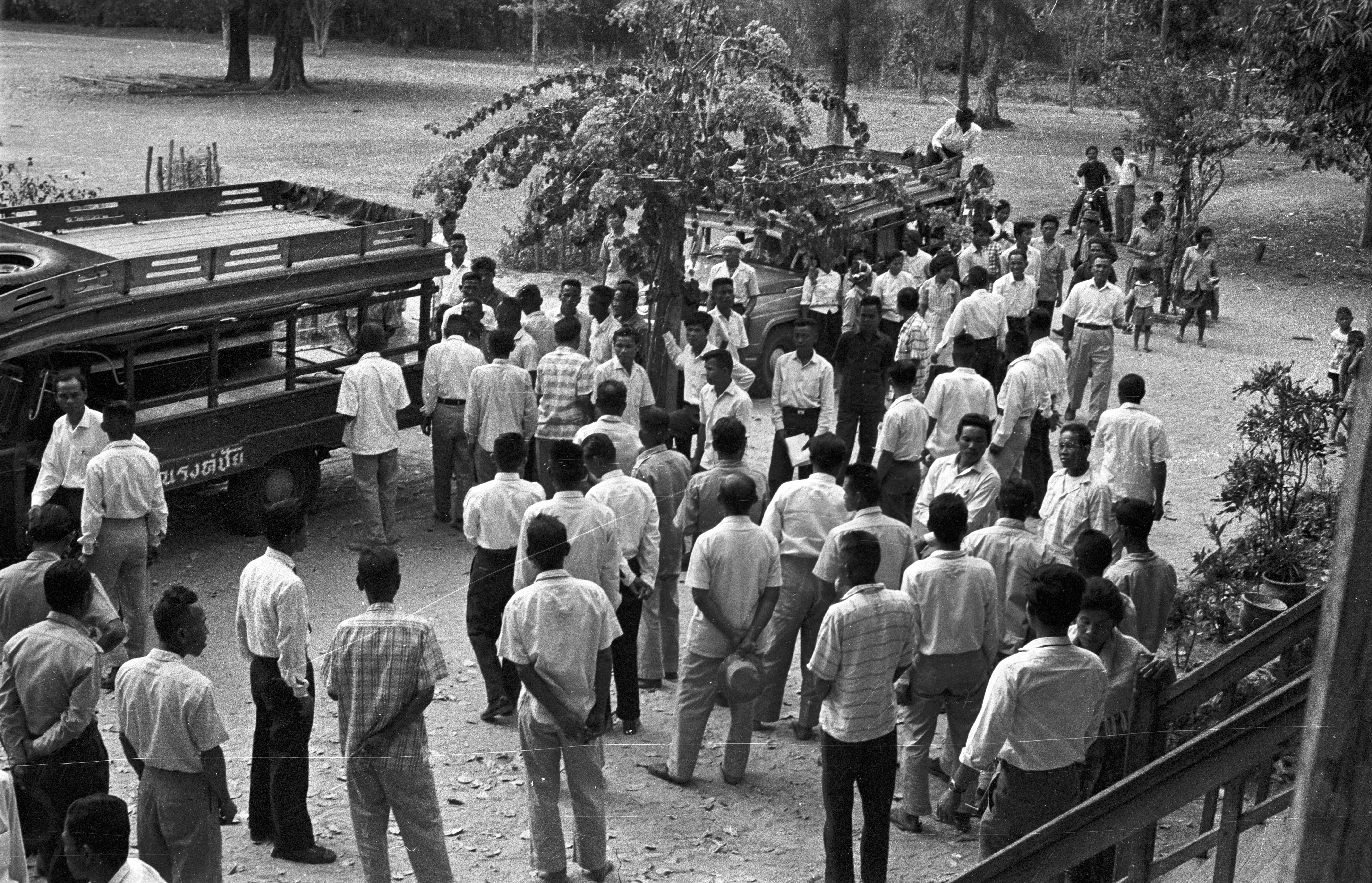 Arrival of group from Ban Bo Phan, 2 photos, Changwat Maha Sarakham, Thailand, January 1964