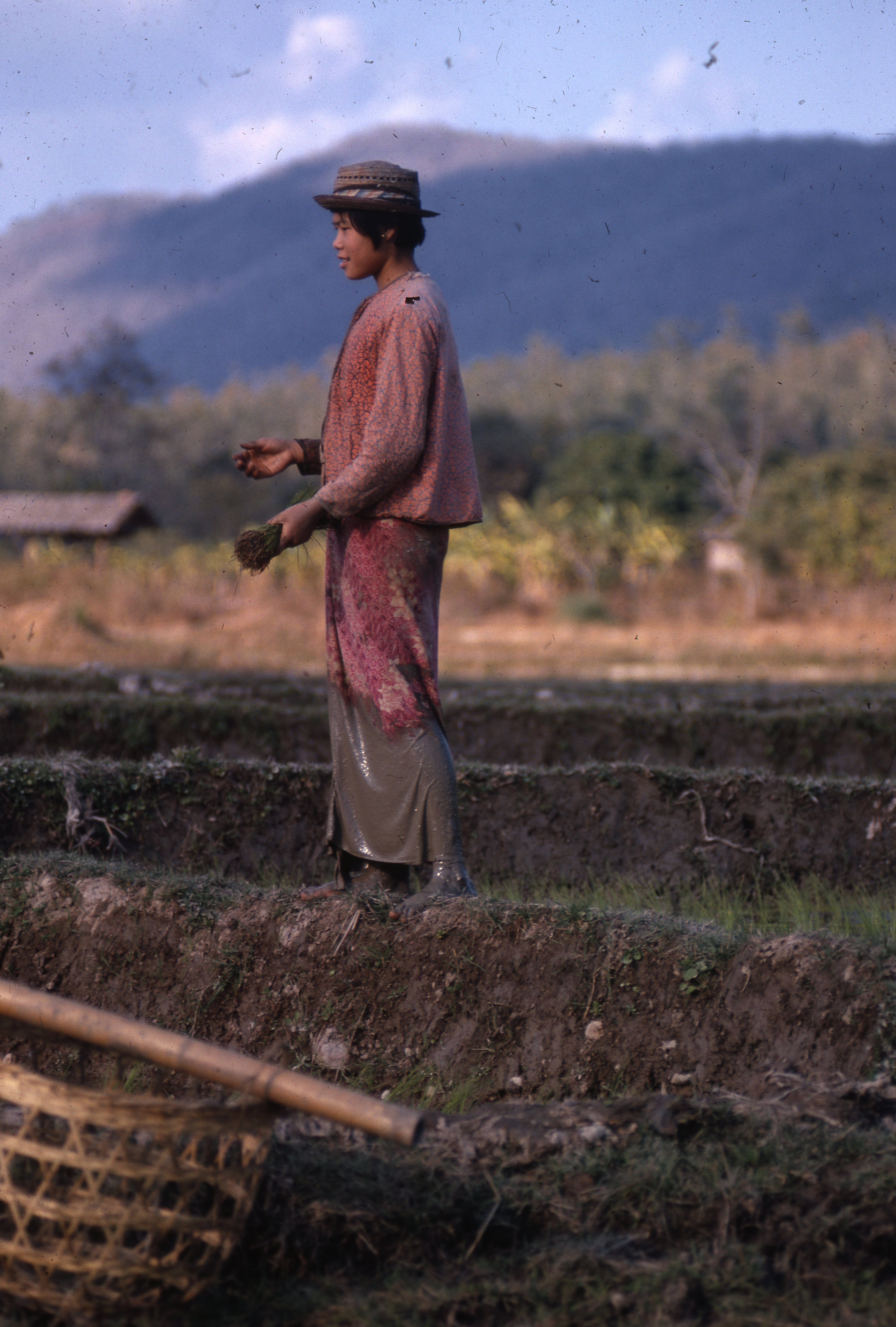 Close-up of young girl holding rice sheaves, 3 photos, Amphoe Mae Sariang, Changwat Mae Hong Son, Thailand, February 1968