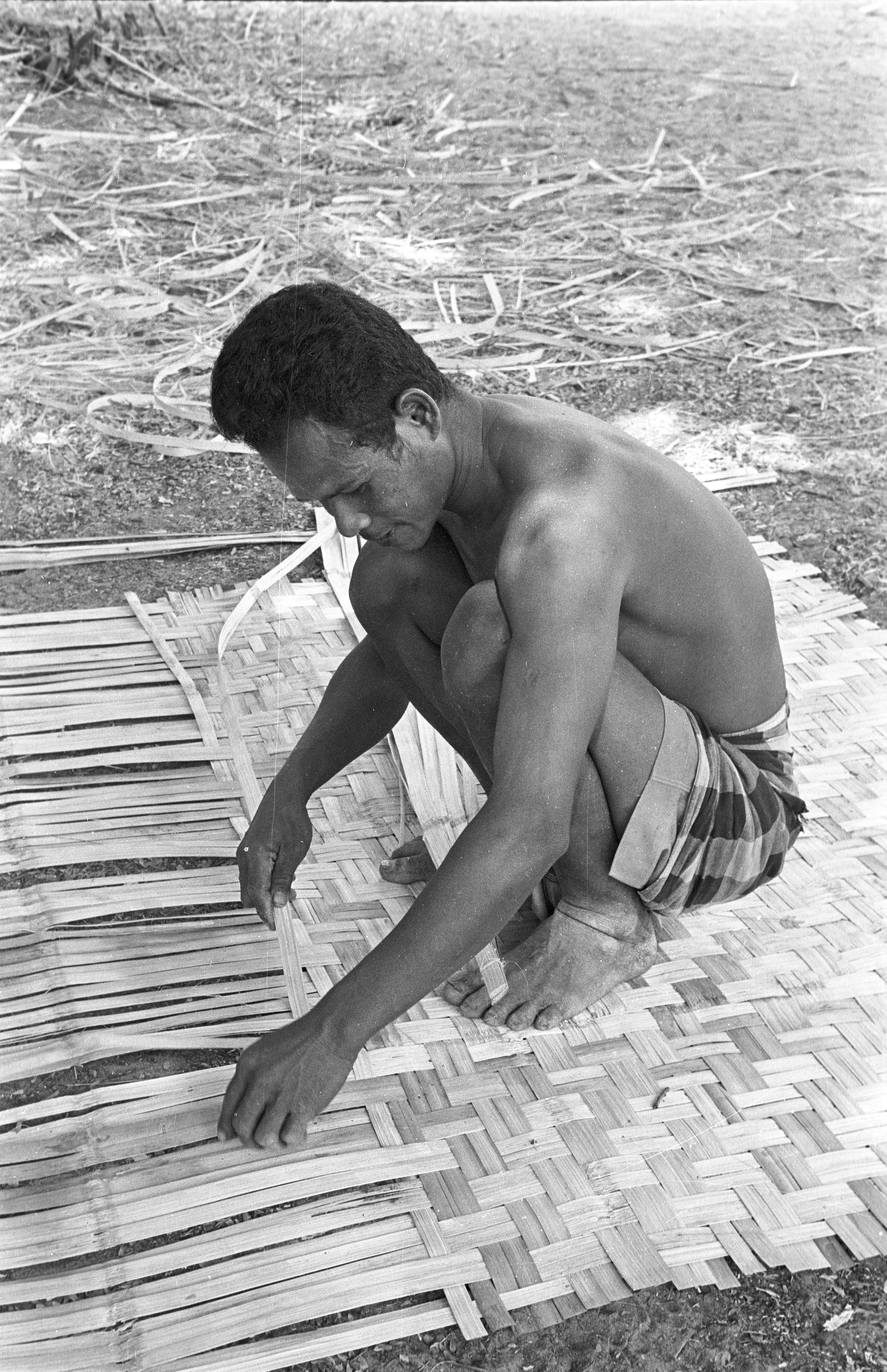 Man weaving bamboo walling; published in Golden Peninsula, Changwat Maha Sarakham, Thailand, January 1964