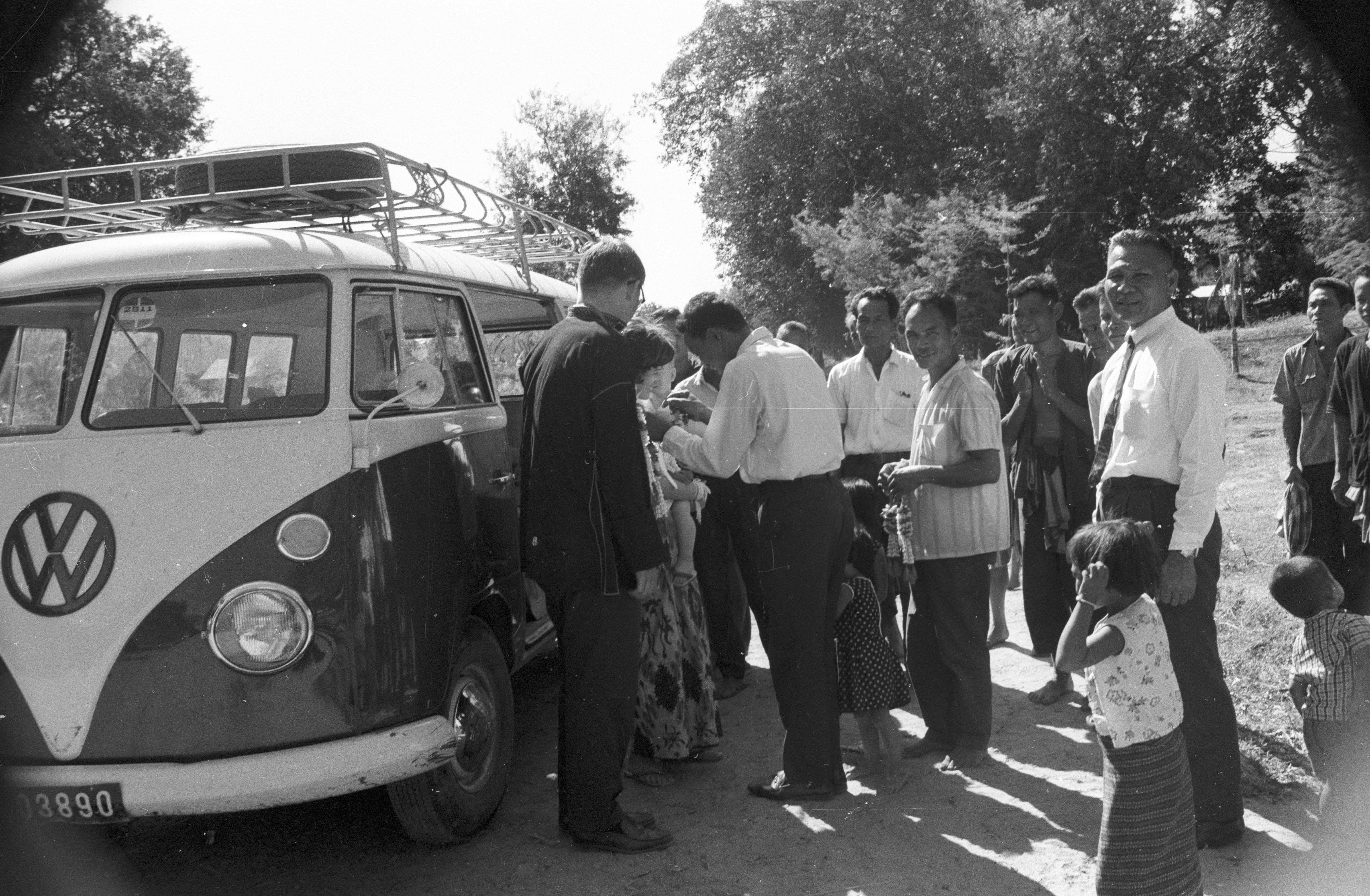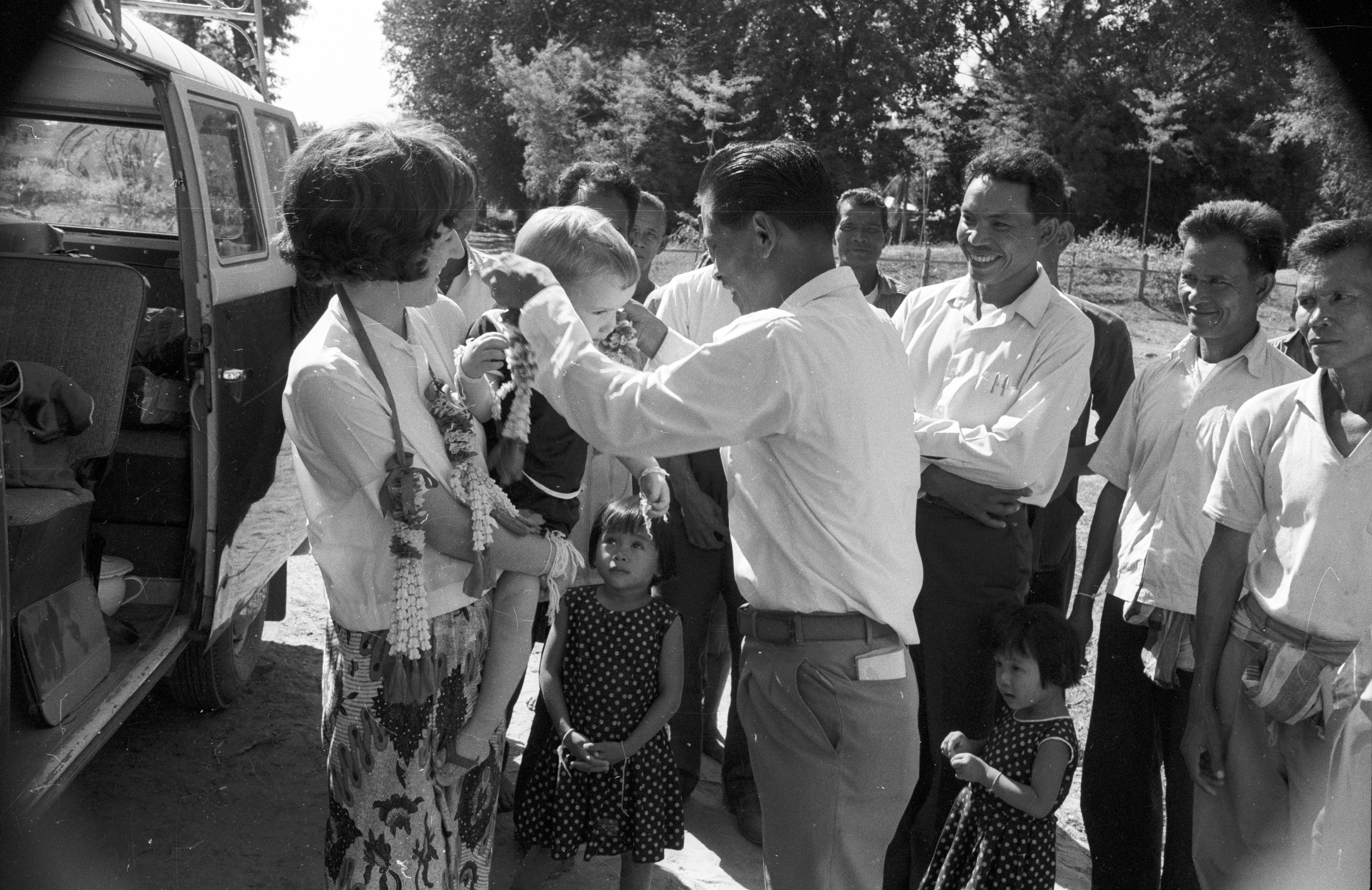 Farewell celebration: Kamnan putting garland on me with Jane, Nick, Charles Keyes and villagers, 2 photos; Khrū Bunthiang just about to put garland on Jane, 3 photos, Ban Nong Tun, Amphoe Muang Maha Sarakham, Changwat Maha Sarakham, Thailand, November 1968