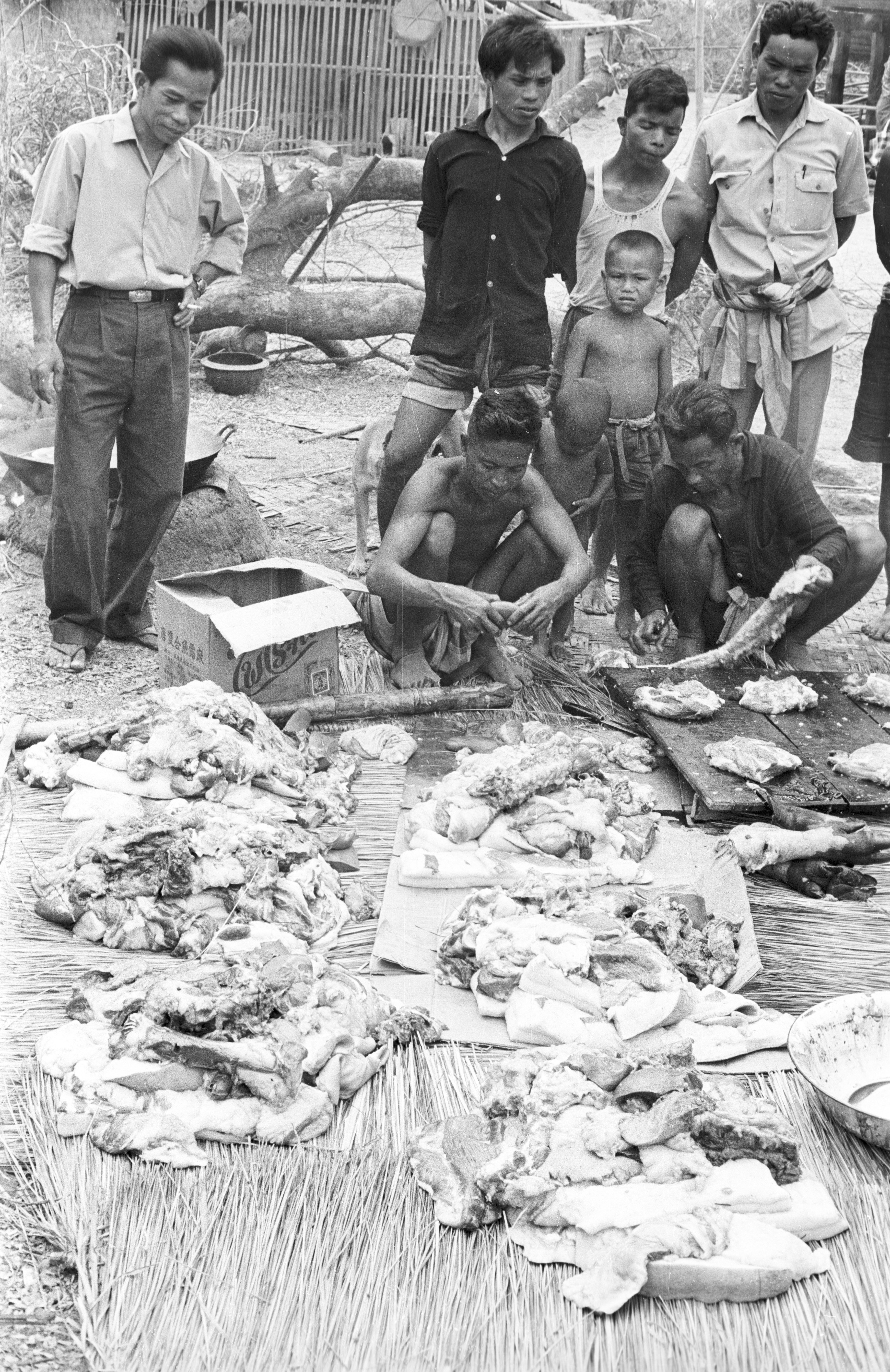 Selling of pork from a boar that had been owned by village man, 2 photos, Changwat Maha Sarakham, Thailand, March 1964