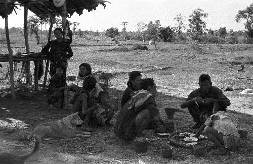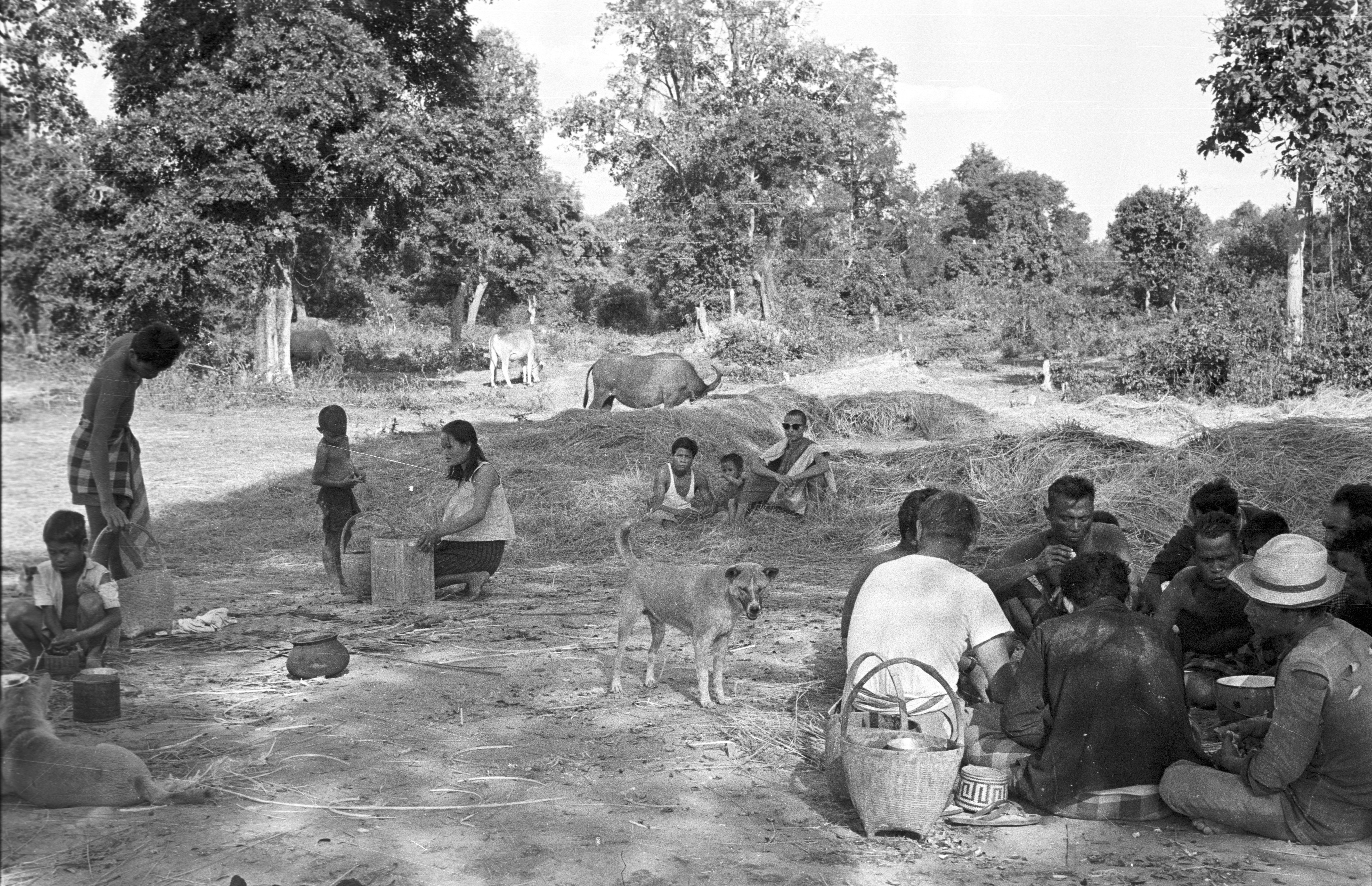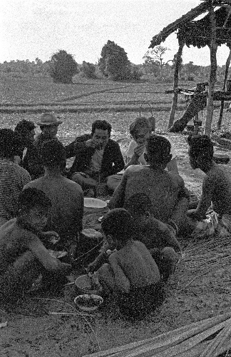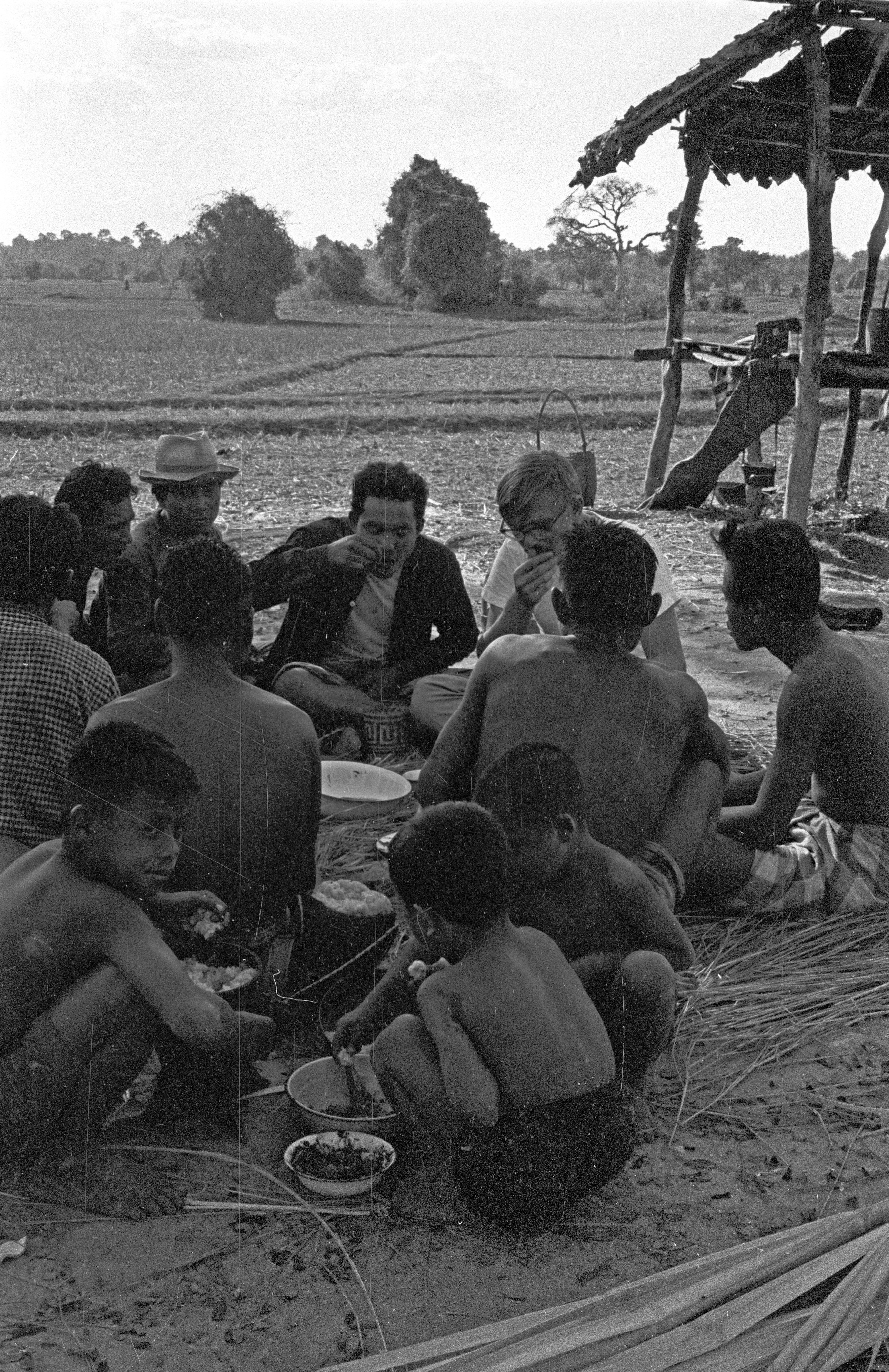 Feast in field after cleaning of pond has been completed, Charles F. Keyes included, 3 photos, Changwat Maha Sarakham, Thailand, March 1964
