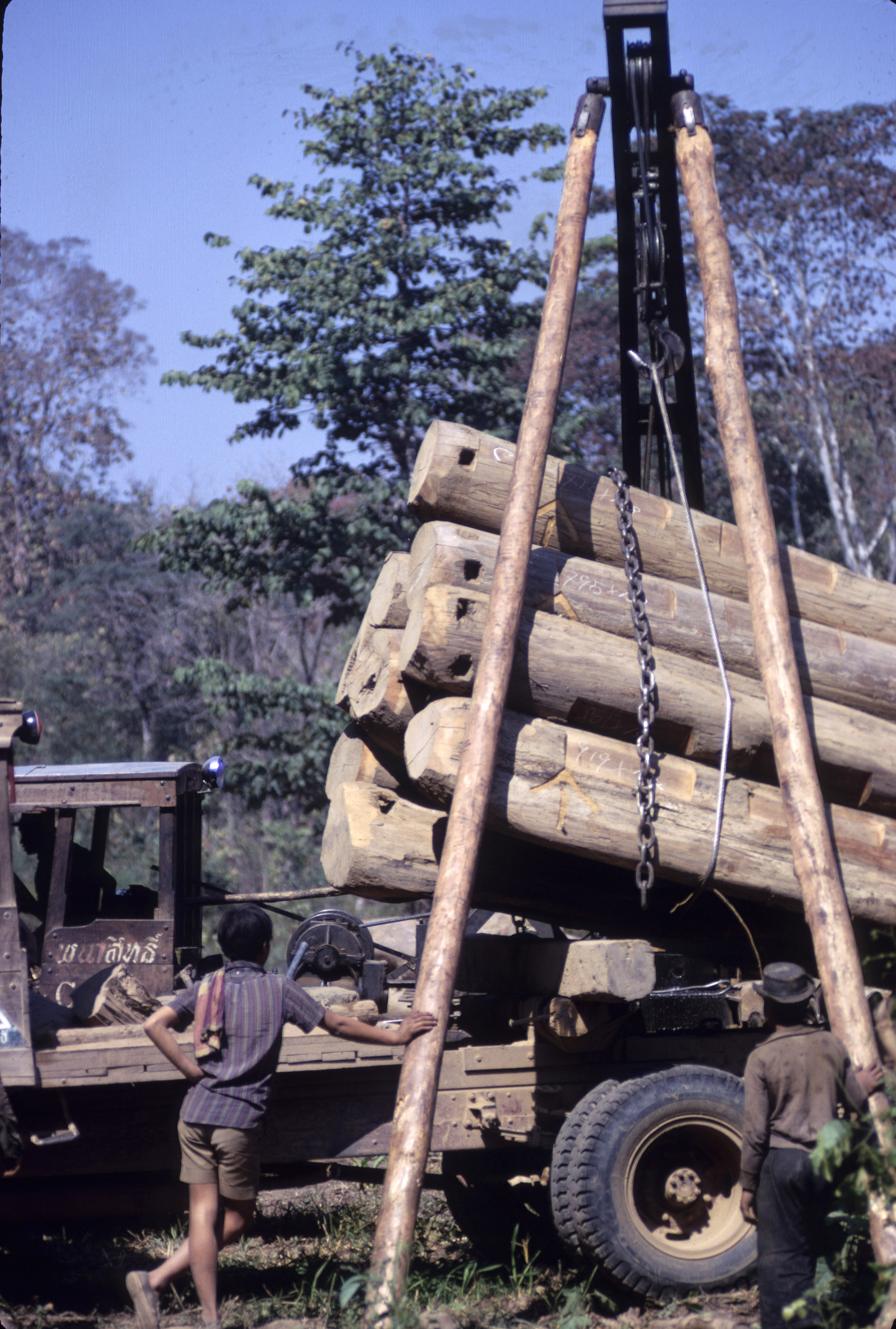 Loading logs on trucks at Bān Huai Māē Kông Pāē, 3 photos, Amphoe Mae Sariang, Changwat Mae Hong Son, Thailand, February 1968
