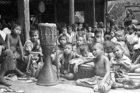 Children at wat with drums at time of ritual, Ban Nong Tun, Amphoe Muang, Changwat Maha Sarakham, Thailand, September 1963